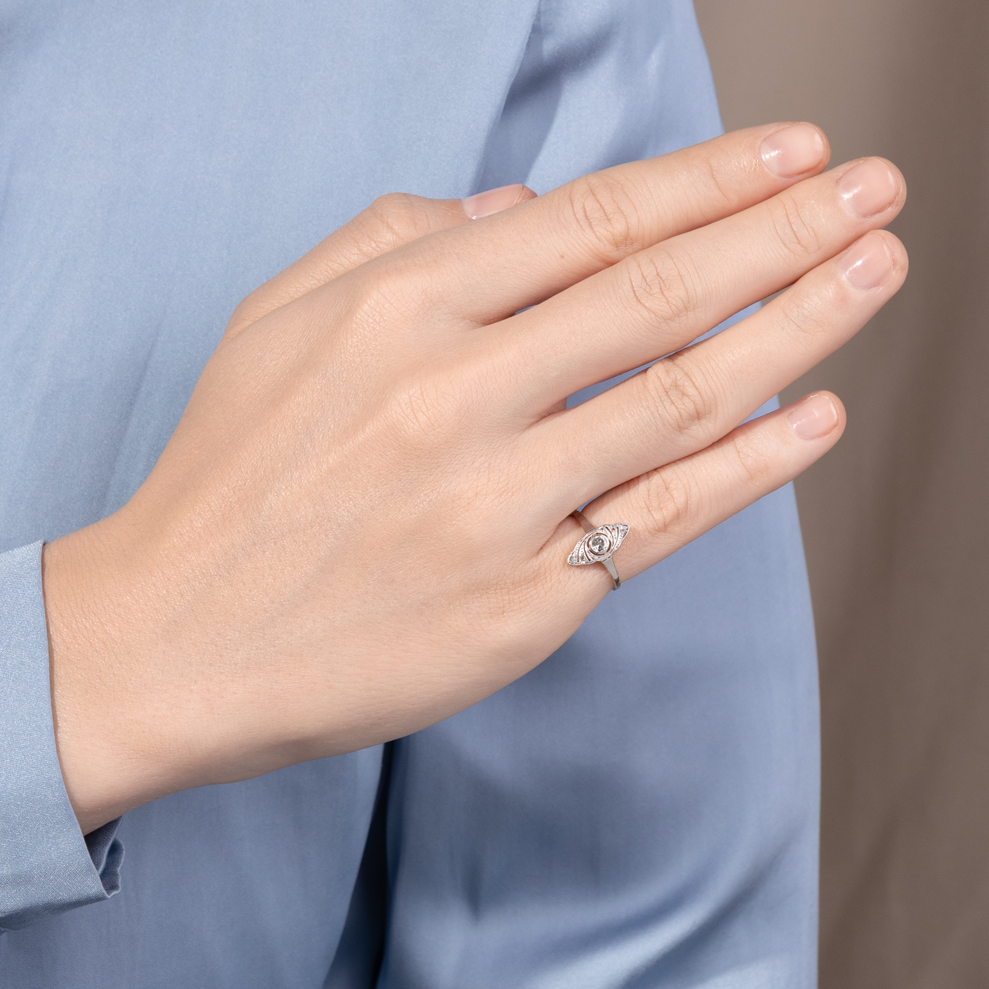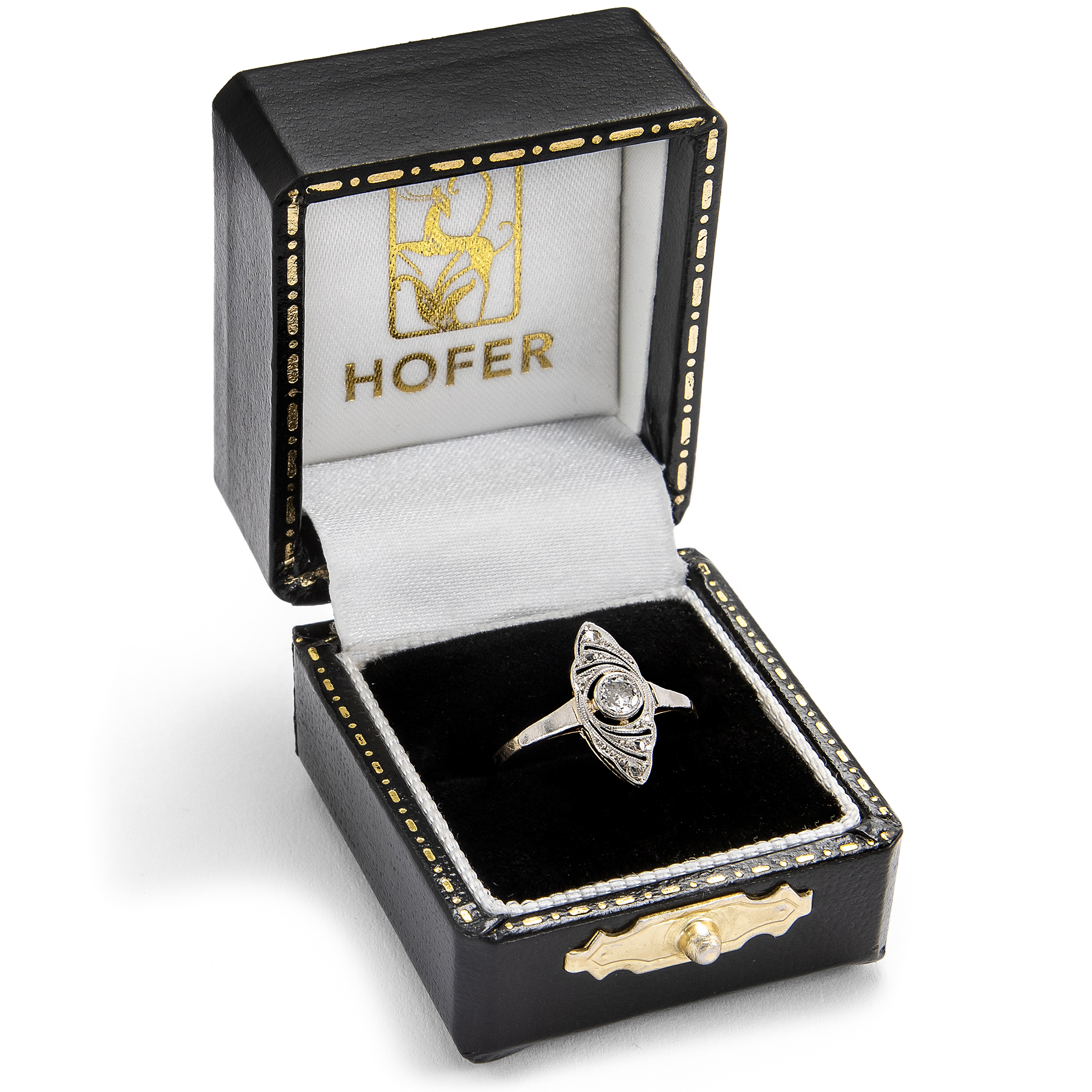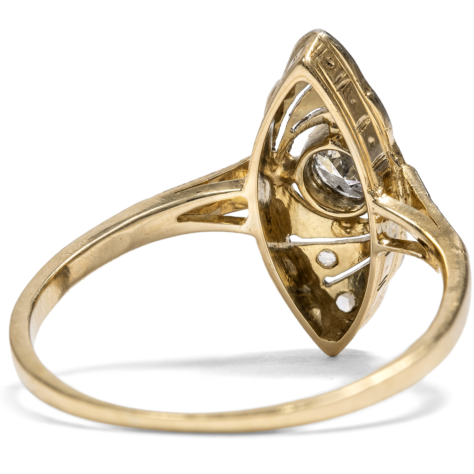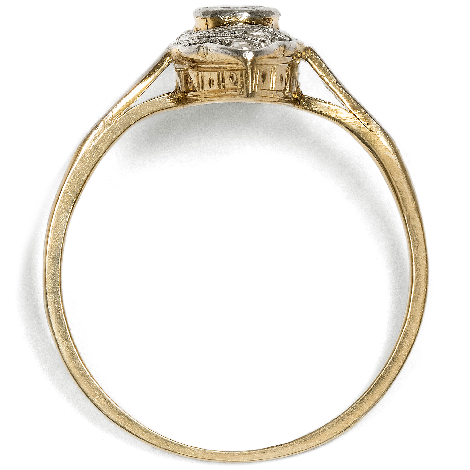 Weißjuwelen, also Schmuckstücke in weißer Farbigkeit, feiern das Licht. Die Neuerung der elektrischen Glühlampe ließ am Ende des 19. Jahrhunderts die Nacht zum Tage werden. Folglich konnte nun auch der Schmuck am Abend strahlen wie noch nie zuvor. Auf den großen Bällen in Paris, London und St. Petersburg wurden immer prachtvollere Diamantcolliers präsentiert, zudem Tiaren, Broschen und Ringe, allesamt Träume in weißen Diamanten. Als dann zu Beginn des 20. Jahrhunderts erst Platin und schließlich auch Weißgold ihren Einzug in die Schaufenster der Juweliere hielten, war dieser weiße Glanz vollkommen, und die Nacht zum Tage gemacht. Der hier vorliegende Ring ist ein typischer Vertreter dieser eleganten Schmuckgattung und in den Jahren um 1920 entstanden. Er besteht aus Gelbgold mit einer Schauseite aus Platin. Diese zeigt wunderbare Durchbrechungen mit feinen Schattenfugen, die in das Metall gesägt sind. Ein schöner Altschliff und vier Diamanten im Rosenschliff besetzen den schiffchenförmigen Ringkopf und setzen Glanzpunkte. Flach gearbeitet und von Hand gefertigt, ist das schöne Schmuckstück ein romantischer und feiner Ring mit nun schon 100 Jahren Geschichte.