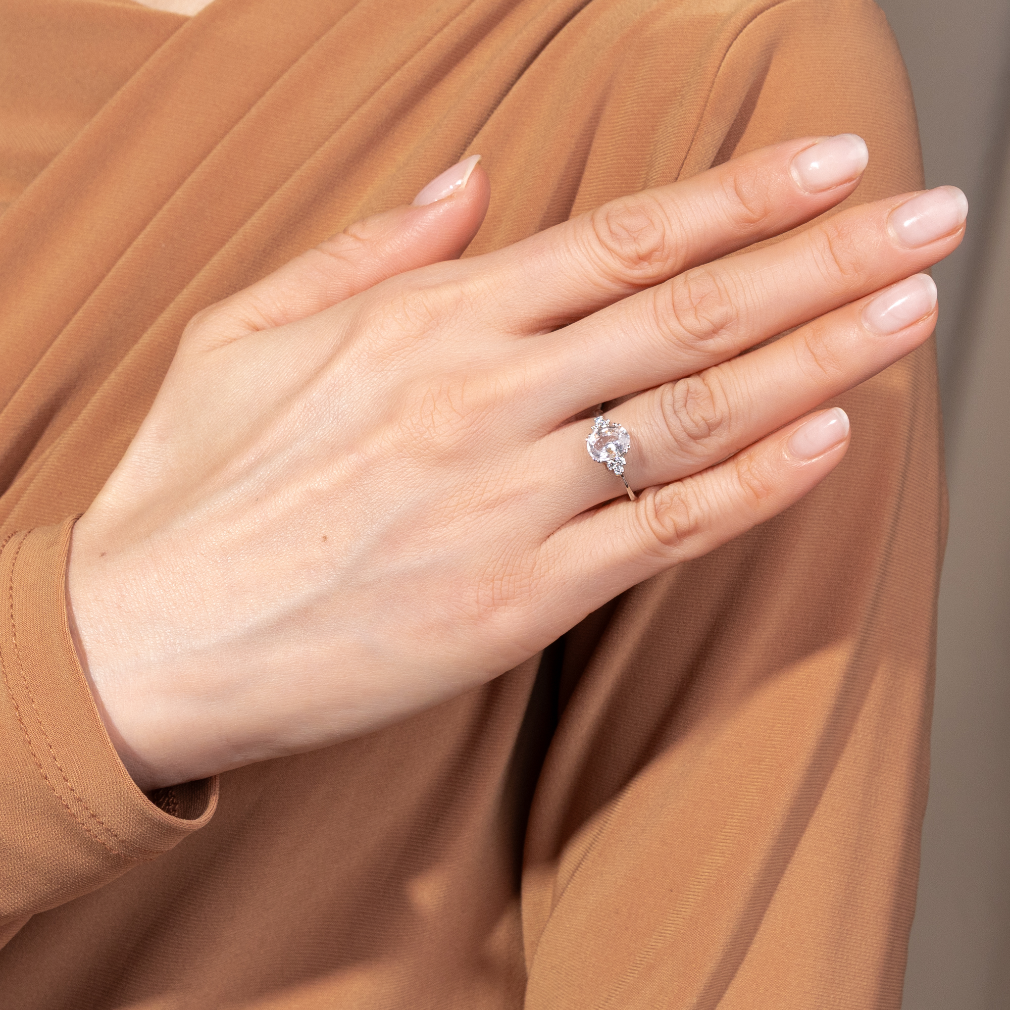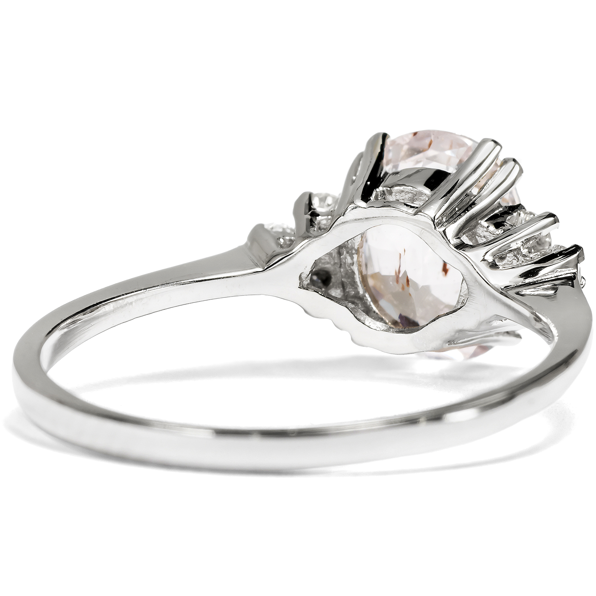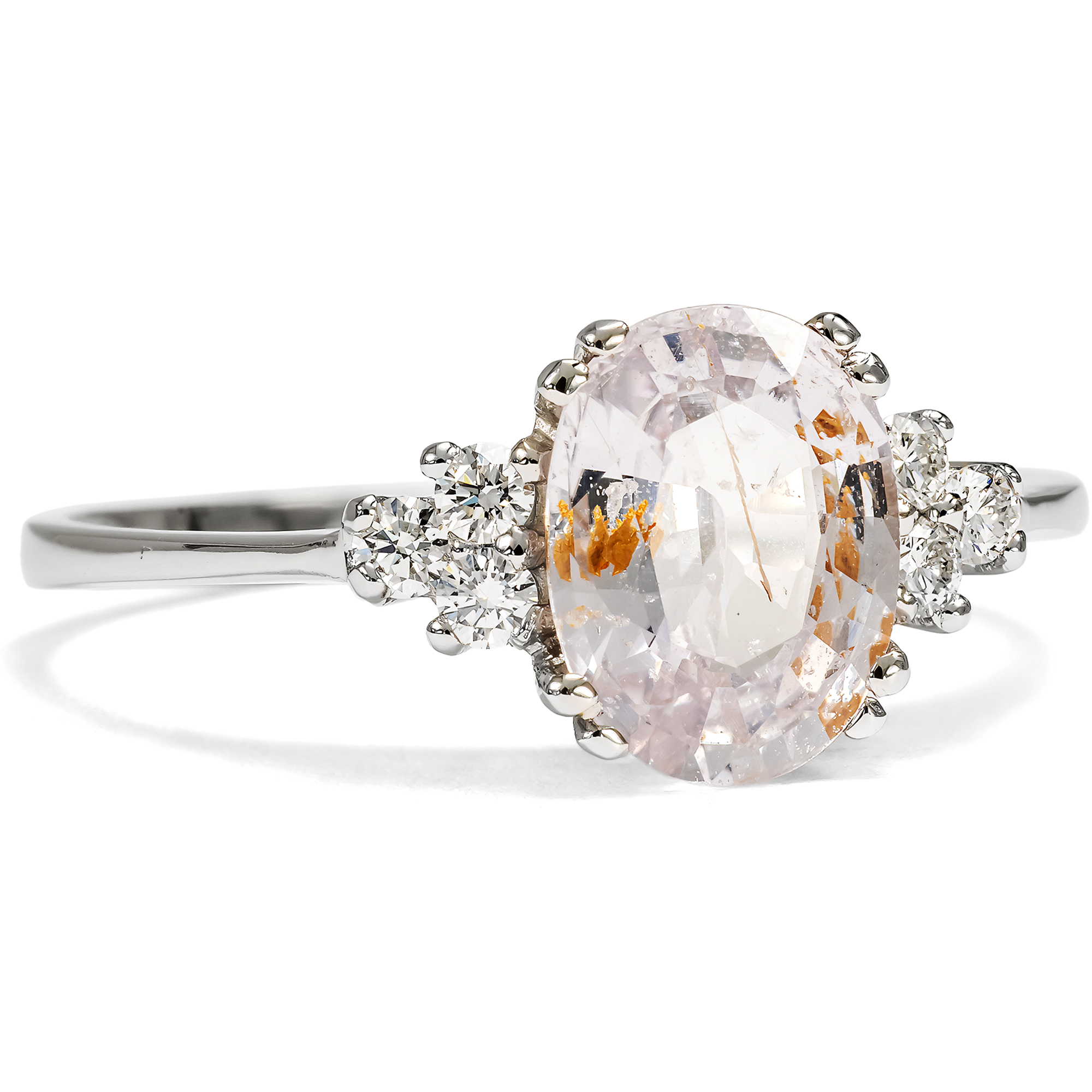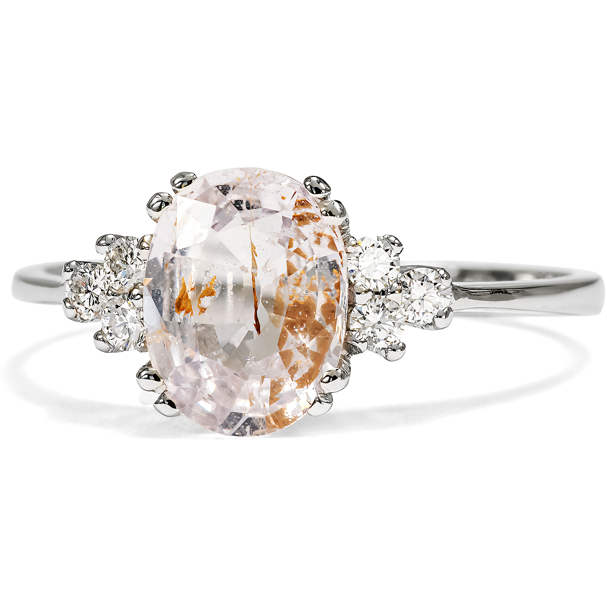 Vor einiger Zeit bereits hatten wir das Glück, eine größere Sammlung Turmaline und Berylle ankaufen zu können, welche seit den 1950er Jahren im Lager eines Edelsteinhändlers in Stockholm geschlummert hatten. Unsere Goldschmiede haben dazu einen Ring entworfen, der je einen dieser Edelsteine in Begleitung von sechs Diamanten präsentiert: Aus nachhaltigen Materialien mit Diamanten, die ebenfalls bereits ihre eigene Geschichte mitbrachten – um so den historischen Materialien ein neues Leben zu geben. Als wir nun eine kleine Sammlung ungewöhnlicher Saphire im selben Format entdeckten, konnten wir nicht widerstehen. Verschiedene Blau- und Rosa-Schattierungen waren darunter, die uns gleich bezauberten. Unsere Goldschmiede haben ihren Ring noch einmal neu aufgelegt – und so ist der hier vorliegende Ring entstanden. Die Mitte des Ringes nimmt ein Saphir in einem hellen Pinkorange ein. Es handelt sich um einen natürlichen, unbehandelten Padparadscha-Saphir. Die Bezeichnung leitet sich von der singhalesischen Bezeichnung für Lotusblüte ab und bezeichnet Steine, die in ihrer Farbe den Blüten dieser anmutigen Pflanze gleichen. Sie lässt sich als eine Mischung aus Orange und Pink beschreiben und wird mit dem warmen Funkeln eines Sonnenuntergangs verglichen. Der hier vorliegende Stein zeigt natürliche Einschlüsse in seinem Inneren. Er wird von sechs funkelnden Diamanten begleitet, rechts und links je drei, welche dem pastelligen Licht des Saphirs weiße Glanzlichter hinzufügen. Gefasst sind die Steine in Platin. Das Platin und die Diamanten sind wie bei allen Ringen aus dieser Serie nachhaltig gewonnen. Sie stammen aus Schmuckstücken, deren Erhaltung es leider nicht mehr zuließ, sie noch restaurieren zu können. Hier aber, in neuer Form, können auch sie ein neues Leben beginnen. Der Saphir ist hier zum ersten Mal Teil eines Schmuckstückes. Uns gefällt dieser Ring, da er schnörkellos ist und dem schönen Edelstein den Vortritt lässt.
