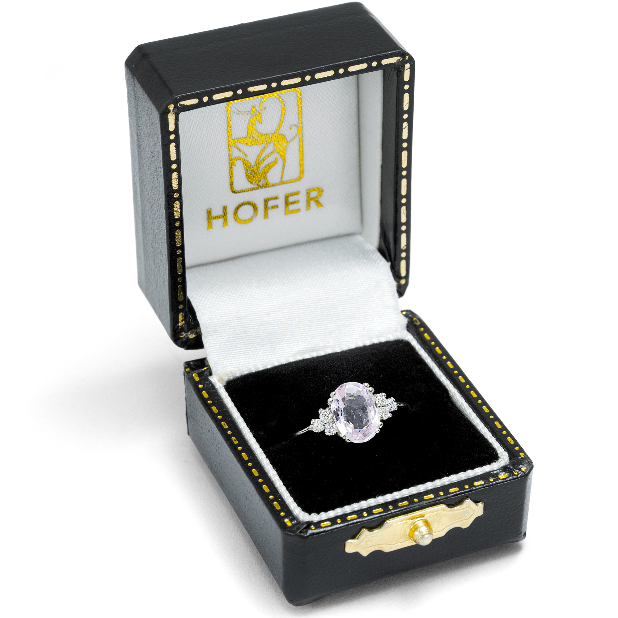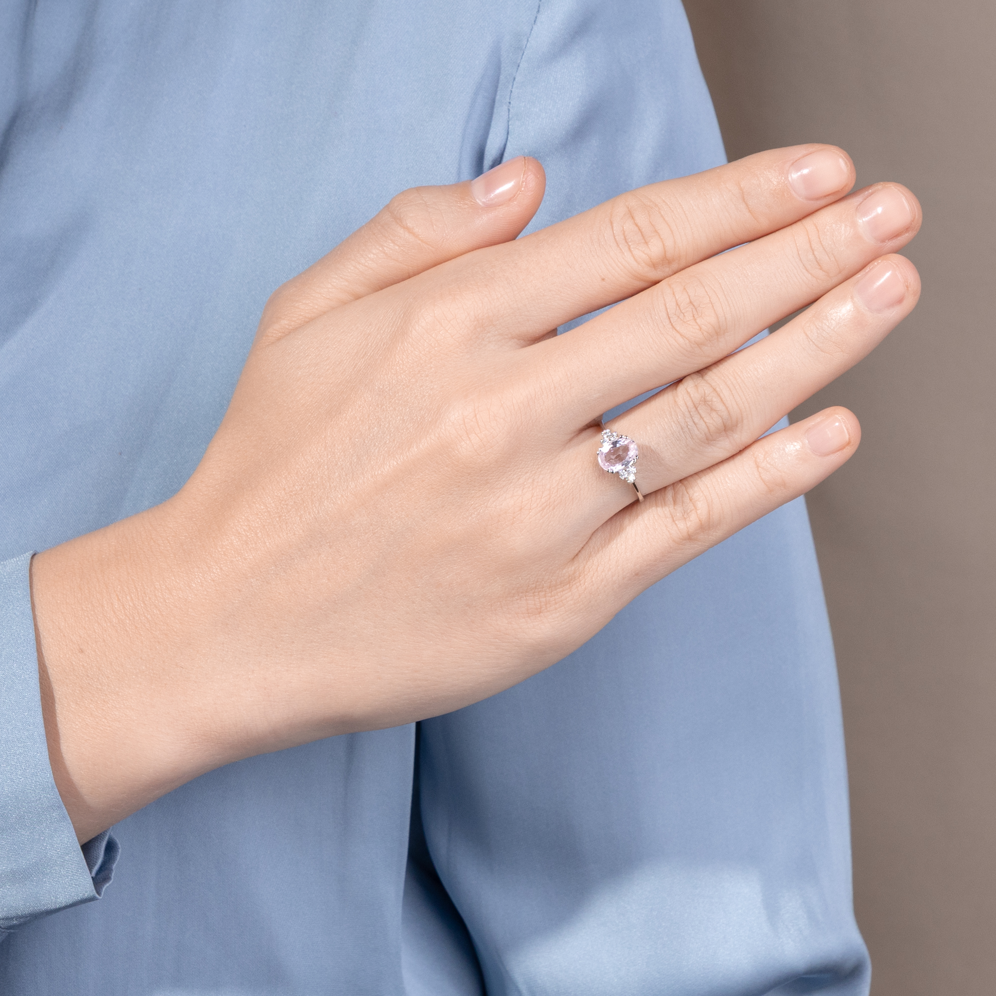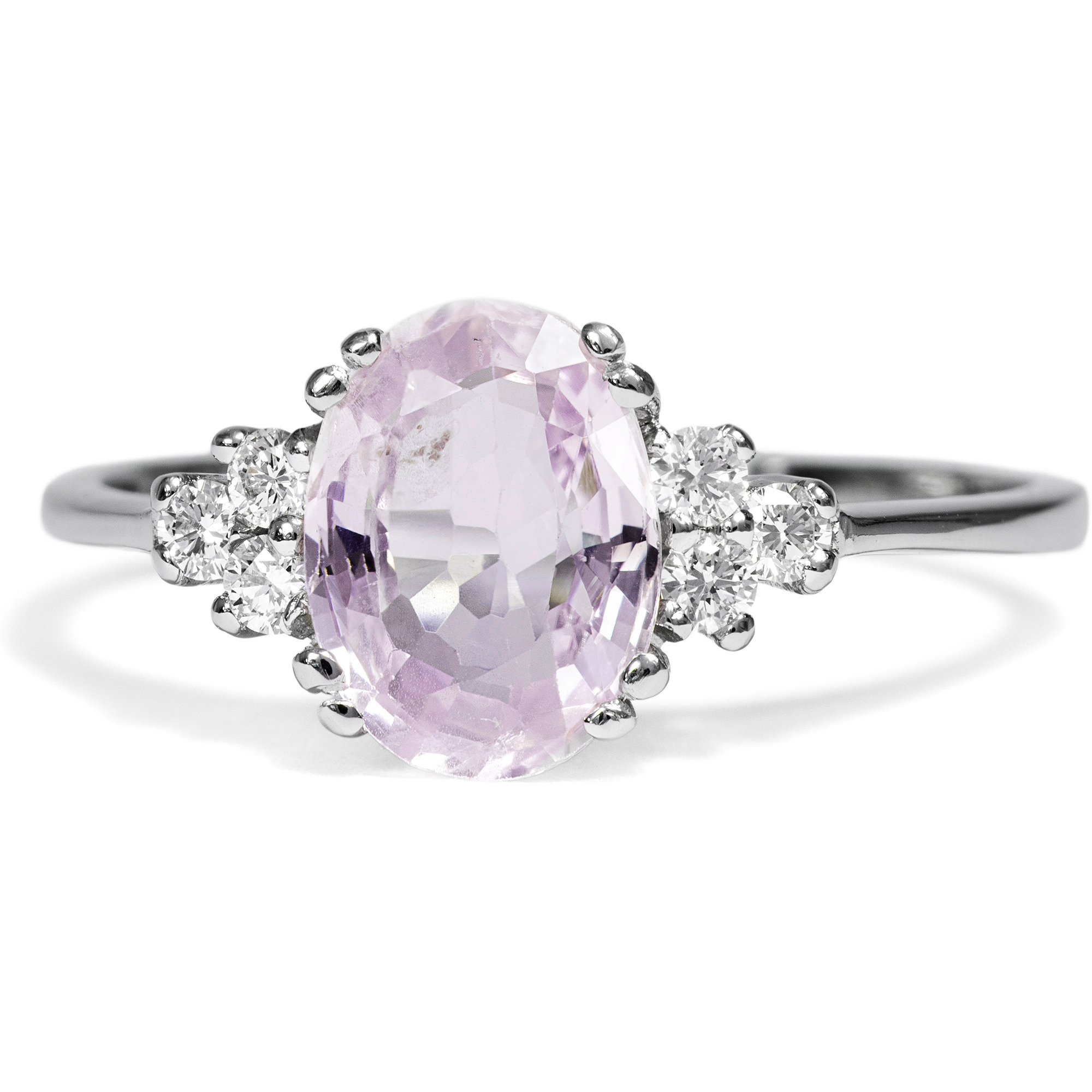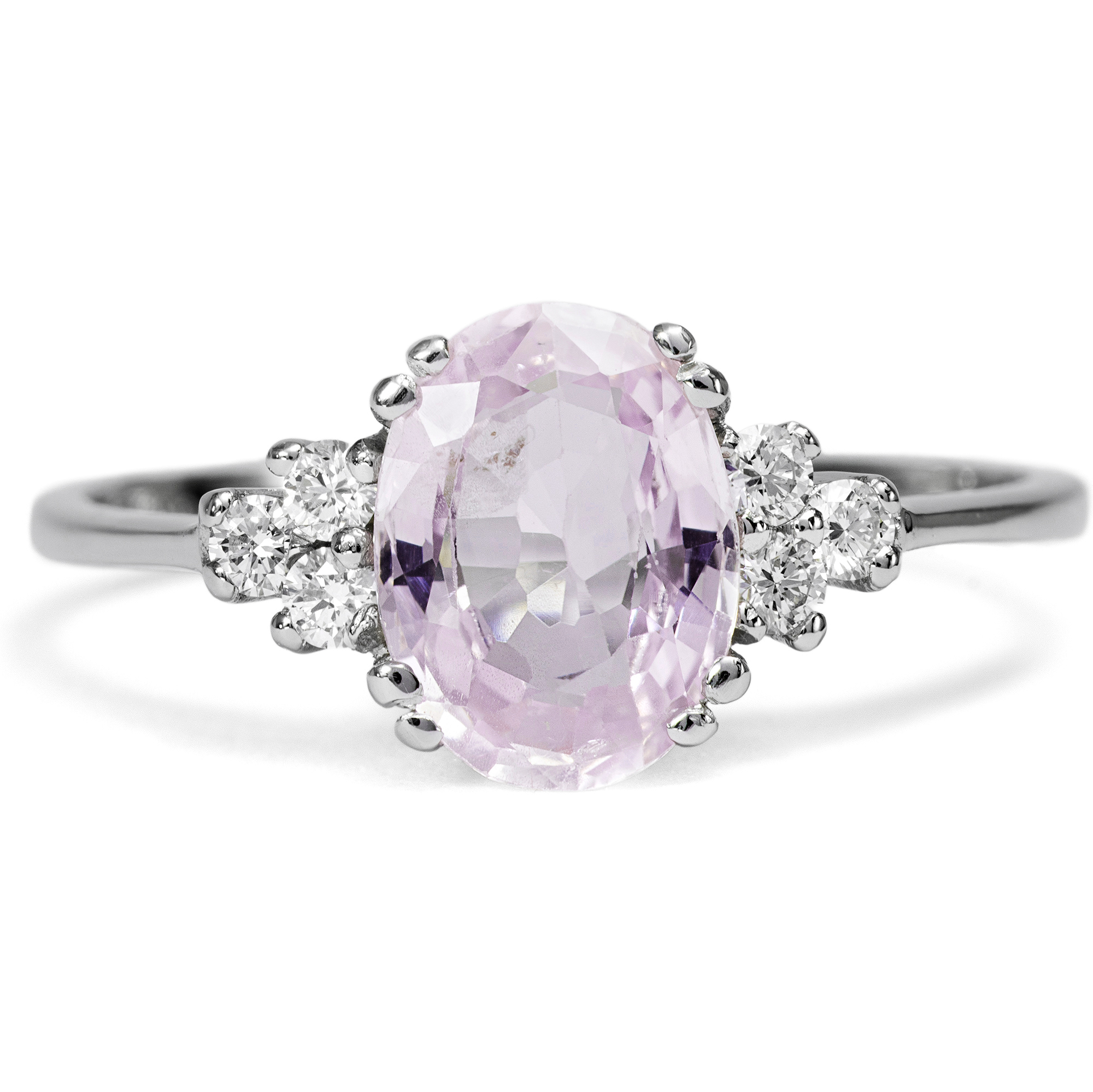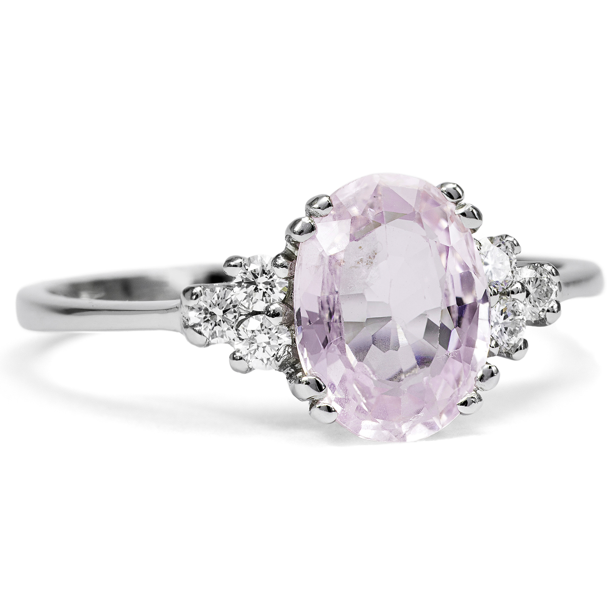 Vor einiger Zeit bereits hatten wir das Glück, eine größere Sammlung von Turmalinen und Beryllen ankaufen zu können, welche seit den 1950er Jahren im Lager eines Edelsteinhändlers in Stockholm geschlummert hatten. Unsere Goldschmiede haben dazu einen Ring entworfen, der je einen dieser Edelsteine in Begleitung von sechs Diamanten präsentiert: Aus nachhaltigen Materialien mit Diamanten, die ebenfalls bereits ihre eigene Geschichte mitbrachten – um so den historischen Materialien ein neues Leben zu geben. Als wir nun eine kleine Sammlung ungewöhnlicher Saphire im selben Format entdeckten, konnten wir nicht widerstehen. Verschiedene Blau- und Rosa-Schattierungen waren darunter, die uns gleich bezauberten. Unsere Goldschmiede haben ihren Ring noch einmal neu aufgelegt – und so ist der hier vorliegende Ring entstanden. Die Mitte des Ringes nimmt ein Saphir in einem hellen Pink mit einer zarten Note ins Orange ein. Ein unabhängiges Labor in den USA hat den Saphir als Padparadscha-Saphir beschrieben. Die Bezeichnung leitet sich von der singhalesischen Bezeichnung für die Lotusblüte ab und bezeichnet Steine, die in ihrer Farbe den Blüten dieser anmutigen Pflanze gleichen. Sie lässt sich als eine Mischung aus Orange und Pink beschreiben und wird mit dem warmen Funkeln eines Sonnenuntergangs verglichen. Der Saphir ist unbehandelt, also auch nicht erhitzt. Unter der Lupe zeigt er zarte, natürliche Einschlüsse in seinem Inneren. Er wird von sechs funkelnden Diamanten begleitet, rechts und links je drei, welche dem pastelligen Licht des Saphirs weiße Glanzlichter hinzufügen. Gefasst sind die Steine in Platin. Das Platin und die Diamanten sind wie bei allen Ringen aus dieser Serie nachhaltig gewonnen. Sie stammen aus Schmuckstücken, deren Erhaltung es leider nicht mehr zuließ, sie noch restaurieren zu können. Hier aber, in neuer Form, können auch sie ein neues Leben beginnen. Der Saphir ist hier zum ersten Mal Teil eines Schmuckstückes. Uns gefällt dieser Ring, da er schnörkellos ist und dem schönen Edelstein den Vortritt lässt.