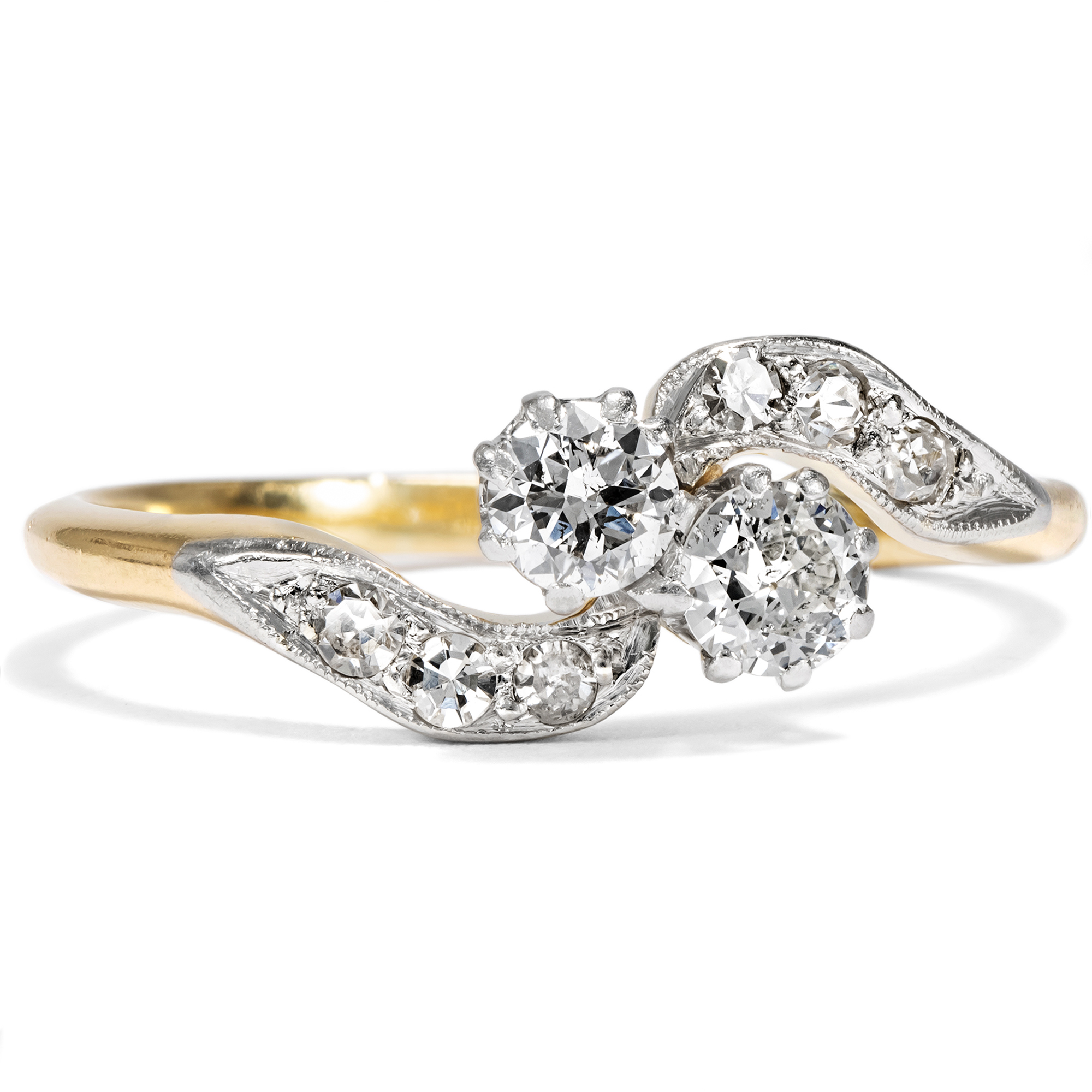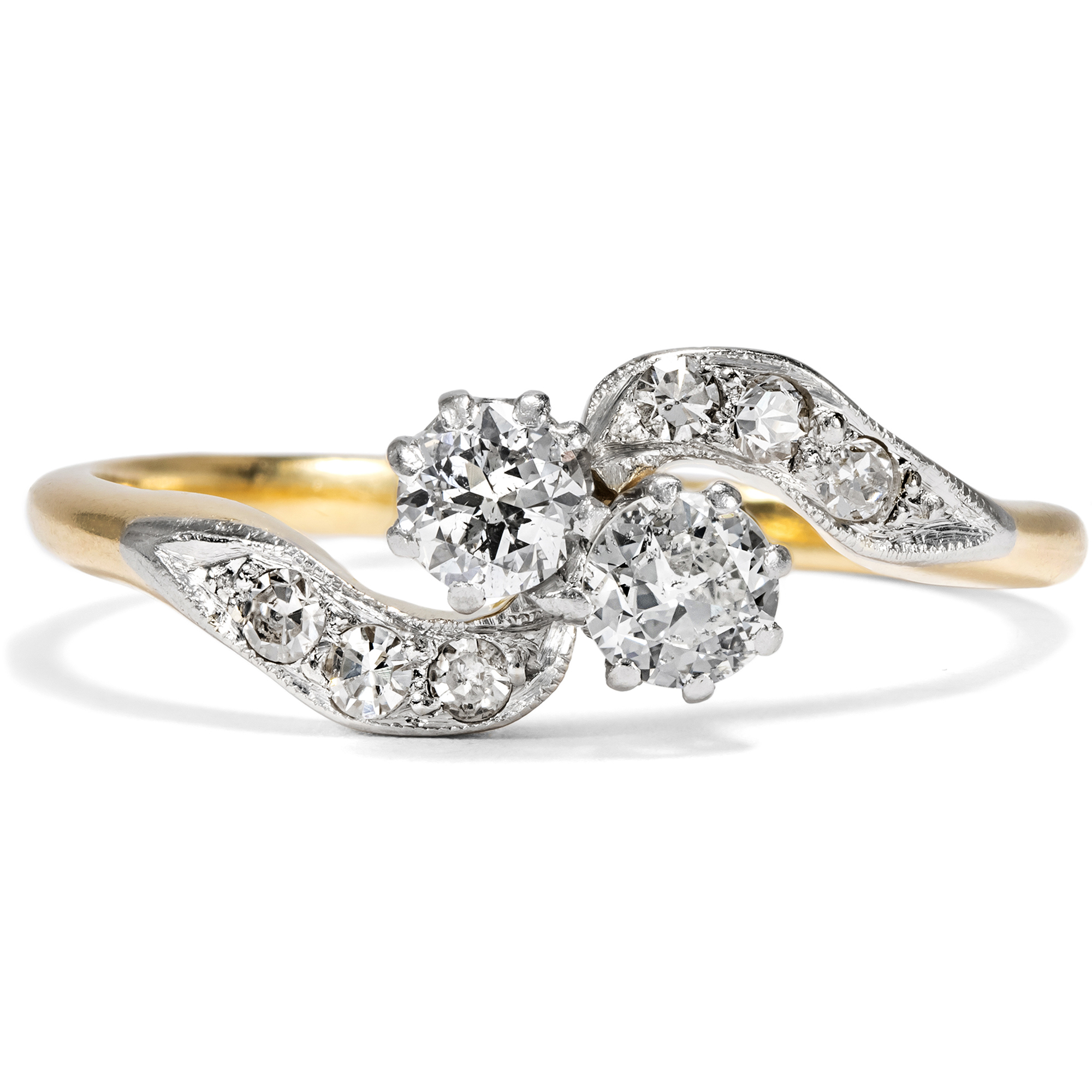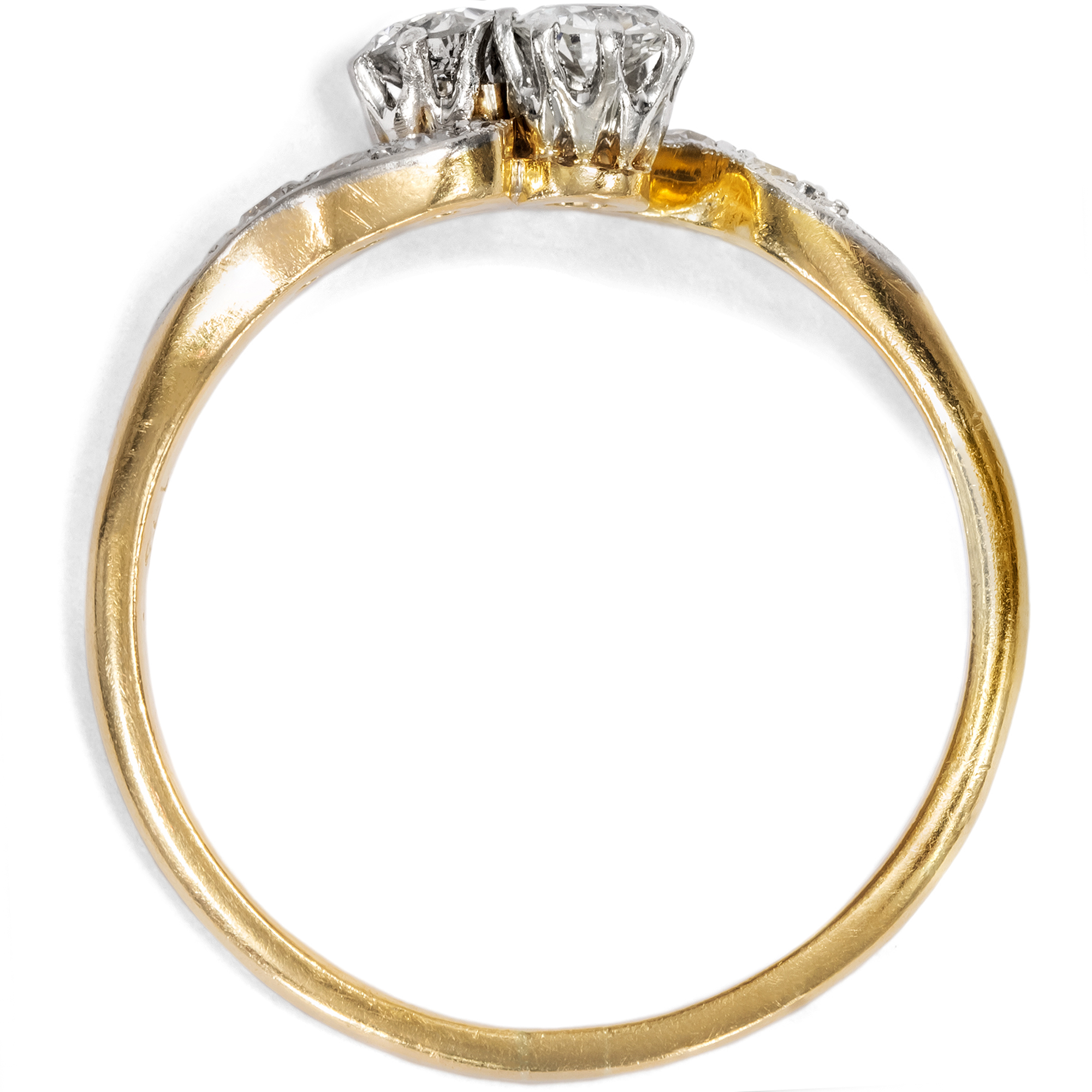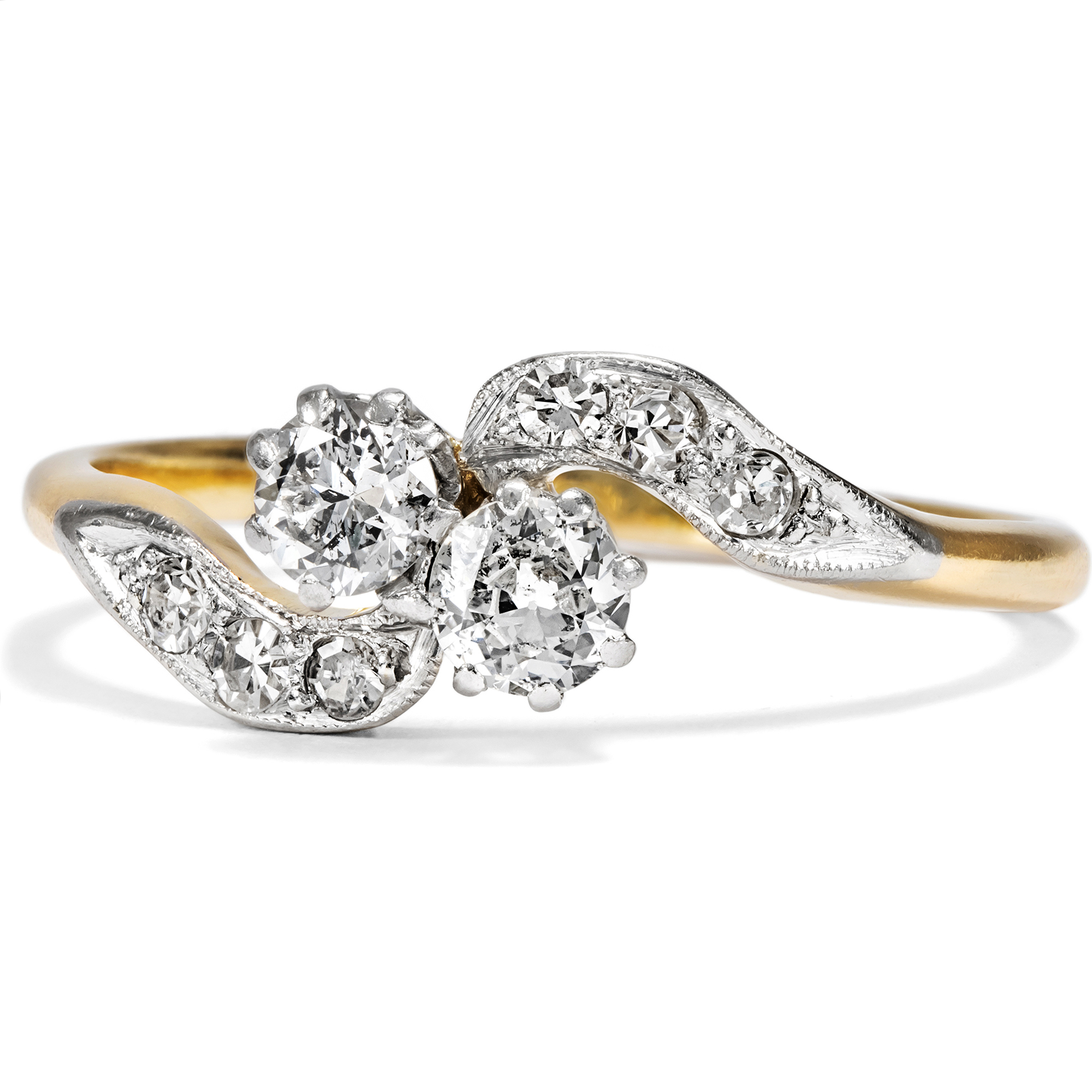 „Toi-et-moi“, Du und ich – mit diesem französischen Begriff bezeichnet man Ringe, die zwei Edelsteine zu gleichwertigen Protagonisten des Entwurfs machen. Schon Napoleon schenkte Joséphine einen solchen Ring, um ihr romantisches Bündnis zu besiegeln. Die beiden Edelsteine sollten die beiden Liebenden darstellen, individuell und doch vereint, jeder für sich vollwertig und doch einander ergänzend. Im vorliegenden Ring nehmen zwei Diamanten im Altschliff von zusammen etwa 0,42 ct diese symbolische Funktion ein. Sie zeigen sich in individuellen Proportionen, in weißer Farbe und schöner Brillanz. Die Diamanten sind dabei in Platin gefasst, um ihr weißes Funkeln weiter zu unterstützen. Auch die geschwungenen Ringschultern sind rechts und links mit kleineren Achtkantdiamanten in Platinfassungen besetzt, sodass der Ring getragen wie eine Komposition aus zwei weißen Schwüngen wirkt. Der Ring ist sehr gut erhalten und wunderbar verarbeitet. Laut Stempelung ist er in Großbritannien entstanden, wir datieren ihn in die Jahre um 1910. Entdeckt haben wir ihn in London.