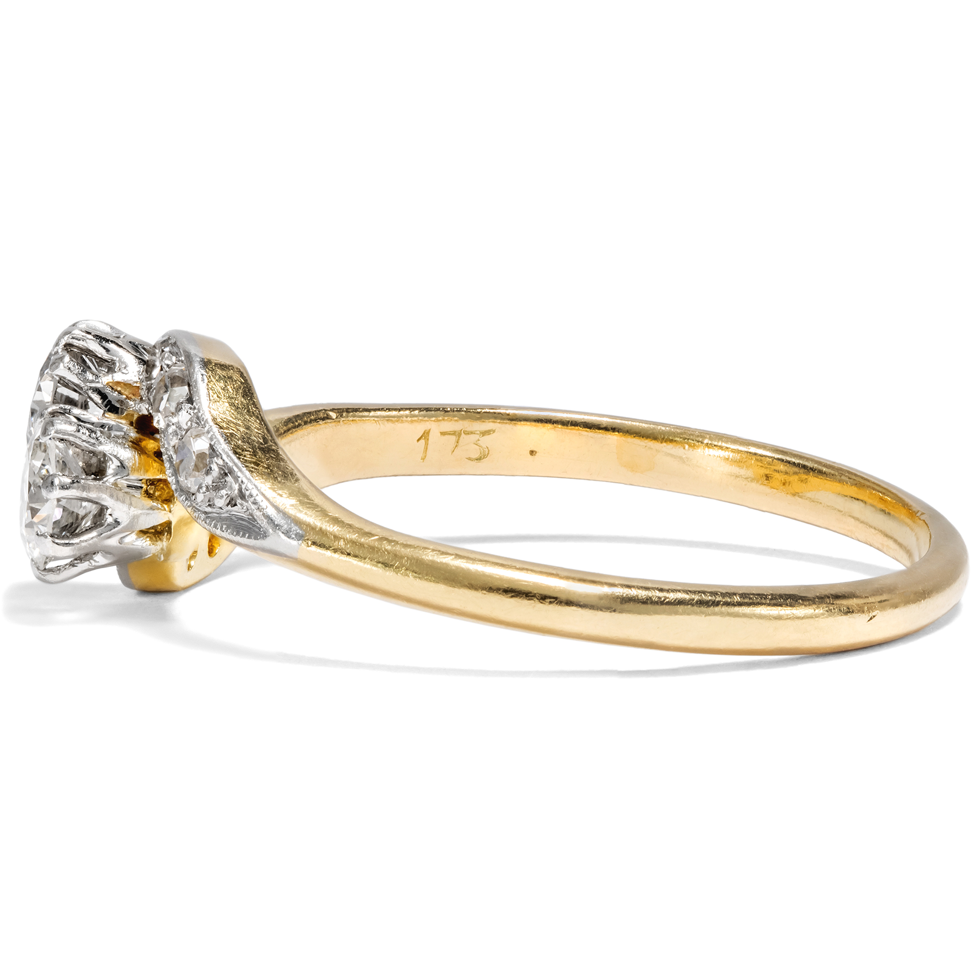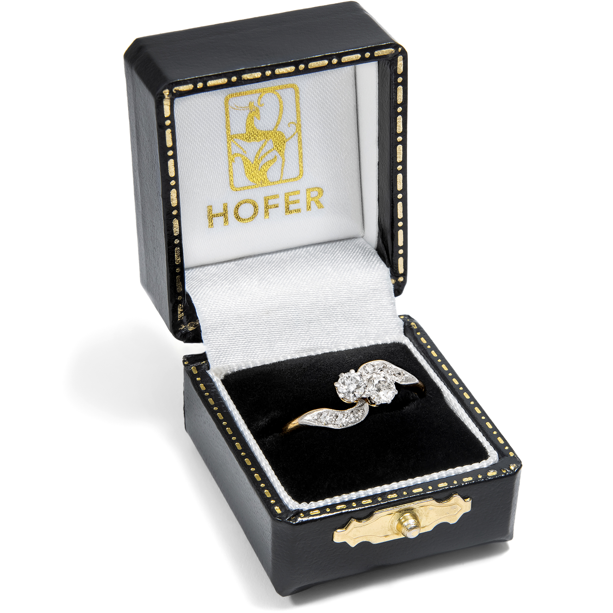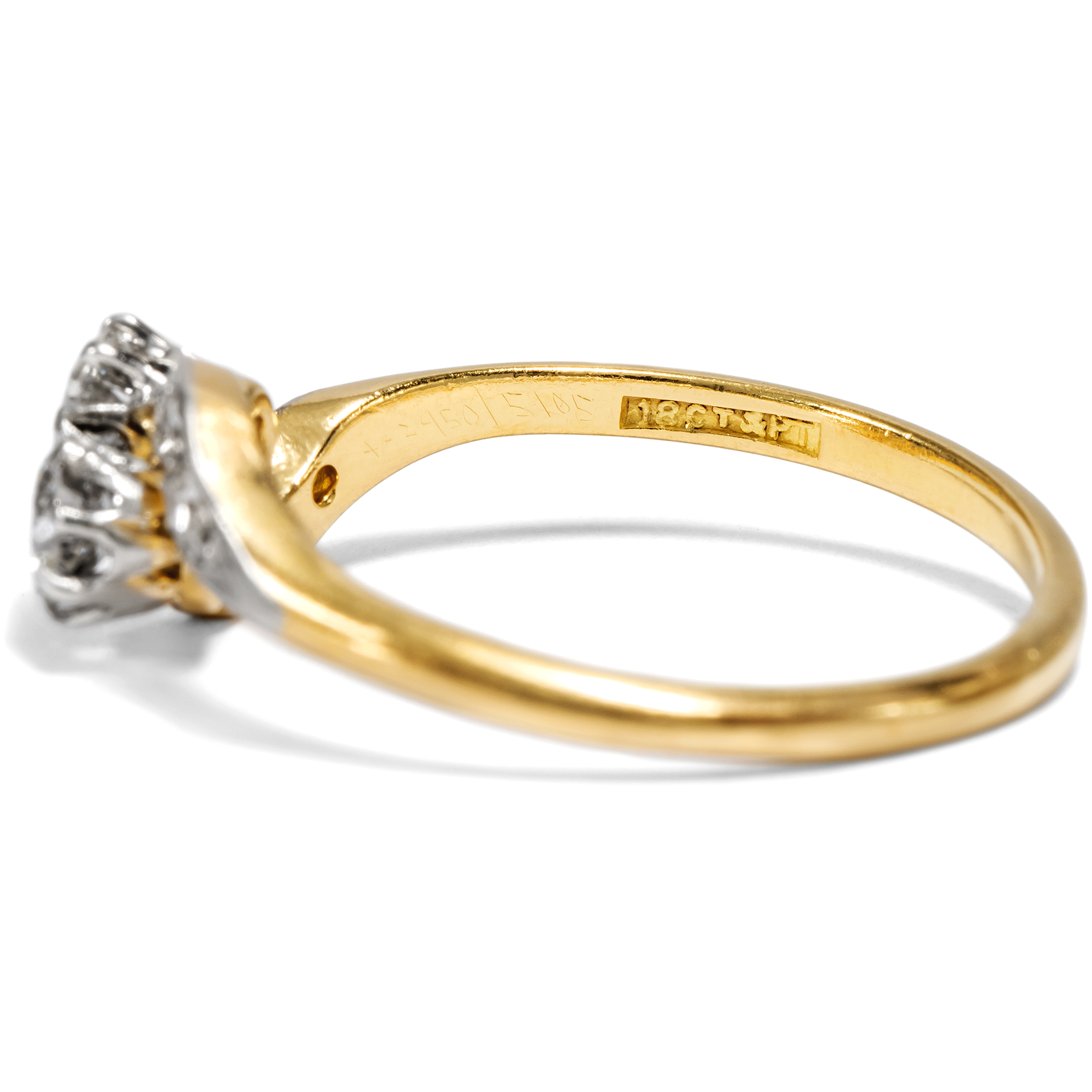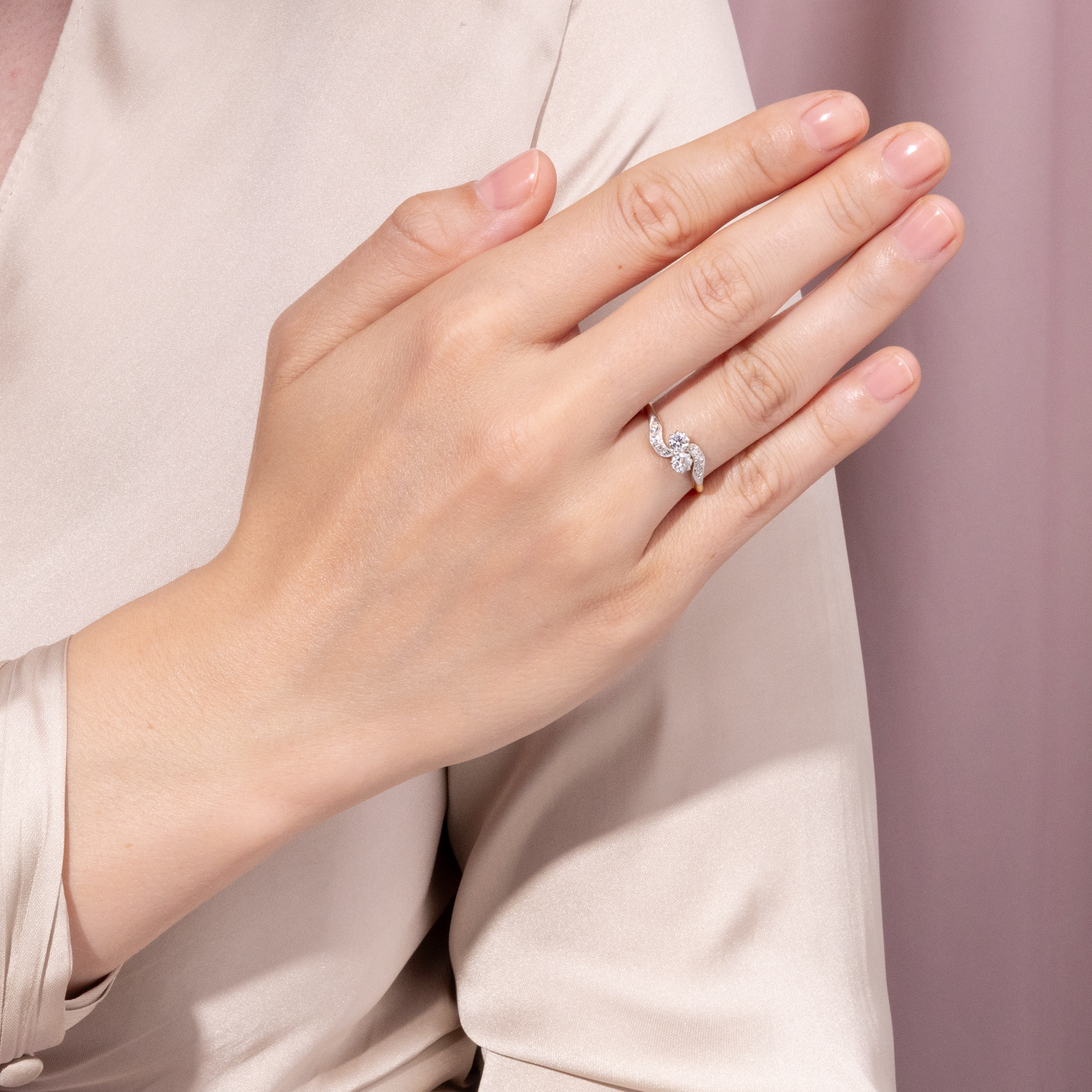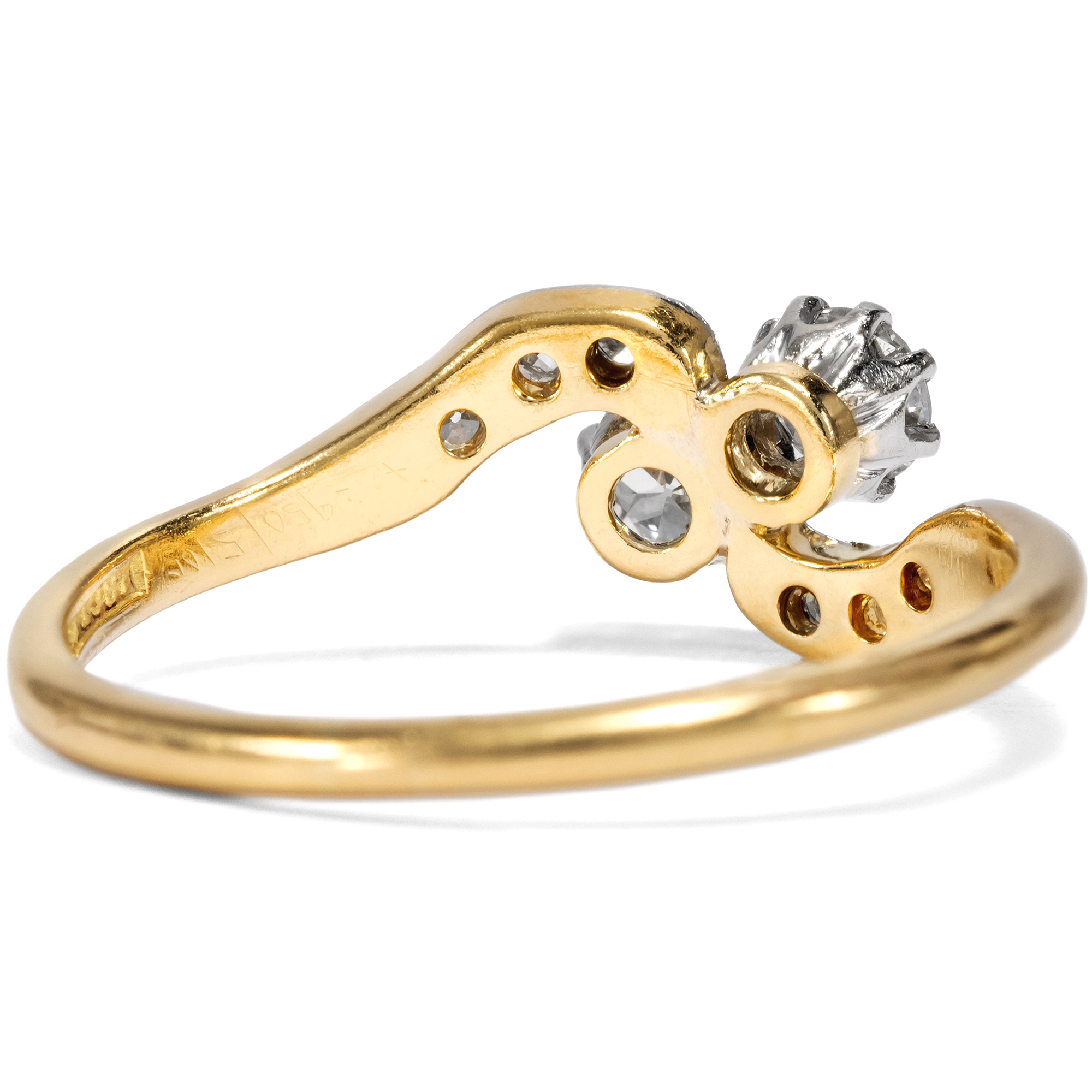 „Toi-et-moi“, Du und ich – mit diesem französischen Begriff bezeichnet man Ringe, die zwei Edelsteine zu gleichwertigen Protagonisten des Entwurfs machen. Schon Napoleon schenkte Joséphine einen solchen Ring, um ihr romantisches Bündnis zu besiegeln. Die beiden Edelsteine sollten die beiden Liebenden darstellen, individuell und doch vereint, jeder für sich vollwertig und doch einander ergänzend. Im vorliegenden Ring nehmen zwei Diamanten im Altschliff von zusammen etwa 0,42 ct diese symbolische Funktion ein. Sie zeigen sich in individuellen Proportionen, in weißer Farbe und schöner Brillanz. Die Diamanten sind dabei in Platin gefasst, um ihr weißes Funkeln weiter zu unterstützen. Auch die geschwungenen Ringschultern sind rechts und links mit kleineren Achtkantdiamanten in Platinfassungen besetzt, sodass der Ring getragen wie eine Komposition aus zwei weißen Schwüngen wirkt. Der Ring ist sehr gut erhalten und wunderbar verarbeitet. Laut Stempelung ist er in Großbritannien entstanden, wir datieren ihn in die Jahre um 1910. Entdeckt haben wir ihn in London.