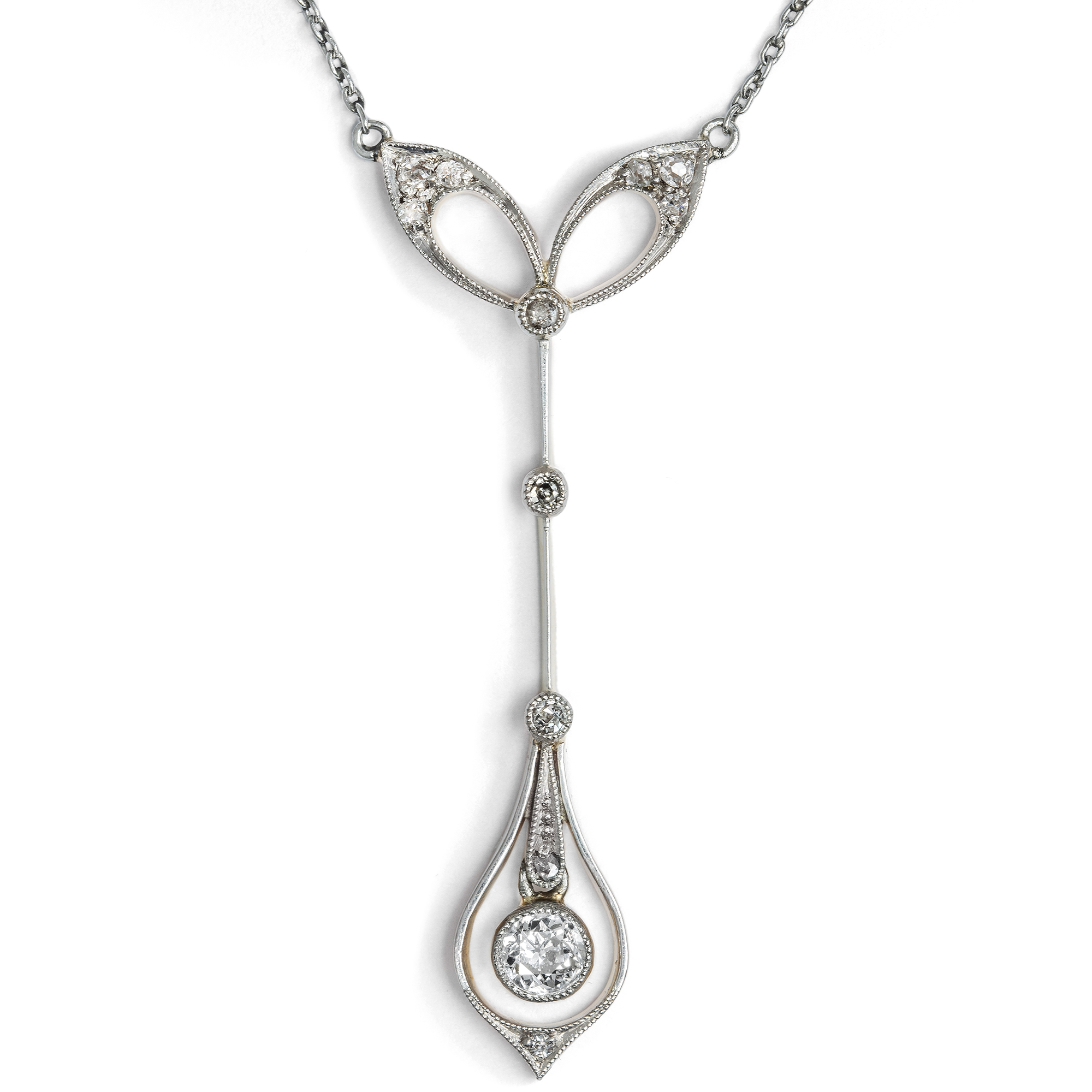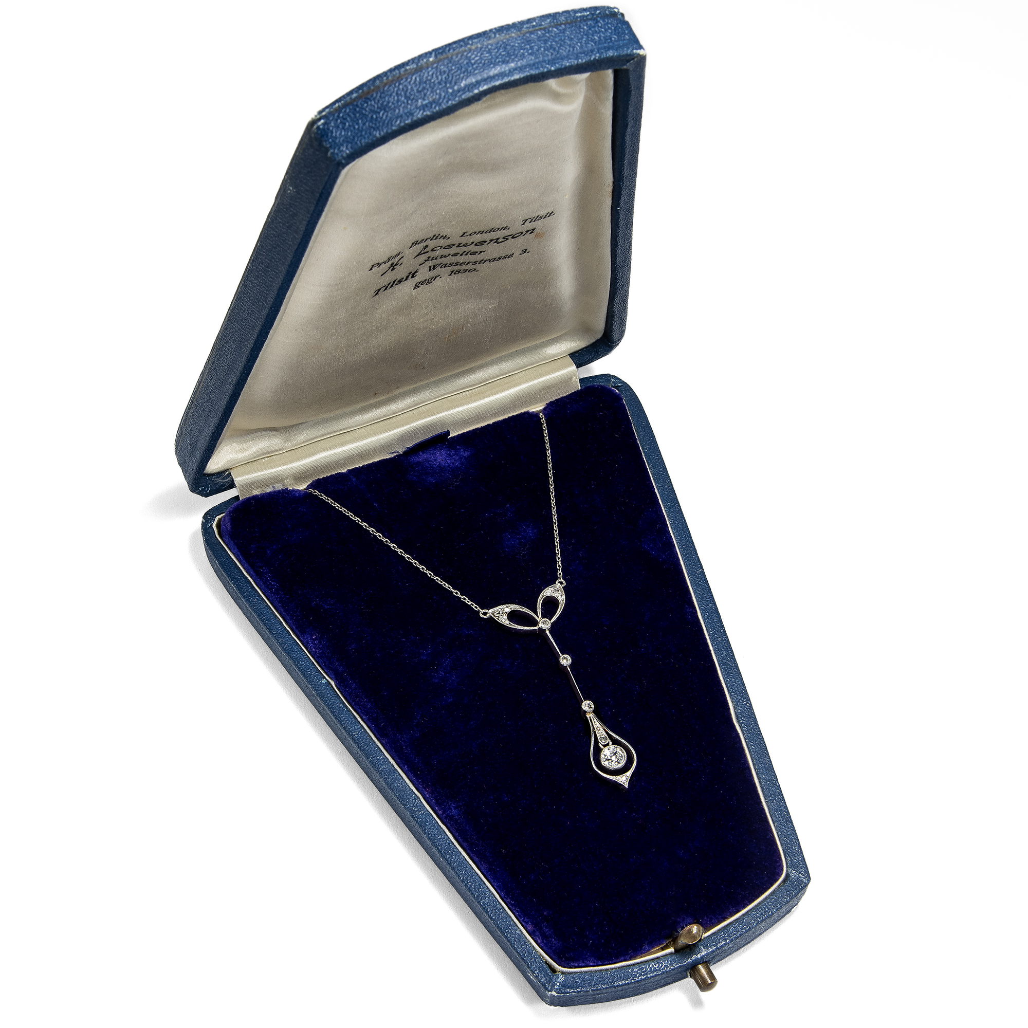 Das elegante Collier ist als ein „Y“ entworfen. An einer zarten Kette im Ankermuster ist ein Anhänger fest montiert, der aus funkelnden Diamanten in Fassungen aus Platin besteht. Der Entwurf beginnt mit einer stilisierten Schleife. Sie hält, an einem zarten Steg beweglich angehängt, einen tropfenförmigen Rahmen. Er umschließt einen funkelnden, 0,25 ct schweren Diamant im Altschliff. Weitere, kleinere Diamanten besetzen die Stege und Schleifenbänder. Colliers dieser Art entstanden zu Beginn des 20. Jahrhunderts in vielen verschiedenen Ausführungen und Ausstattungen. Dieses ist besonders fein verarbeitet und schön ausgestattet: Die Diamanten haben eine gute Qualität und die von Hand gefertigten Stege und Fassungen sind bewundernswert perfekt gearbeitet. Die Verwendung von Platin auf einem Unterbau aus Gold und die antiken Schliffe der Diamanten lassen uns das Collier in die Jahre um 1910 datieren. Schmuck mit einer Schauseite aus Platin auf Gold herzustellen war damals das übliche Verfahren, um weiße, hell leuchtende Schmuckstücke zu erschaffen. Dies hatte technische (und preisliche!) Gründe; Platin wurde noch nicht so lange in der Schmuckherstellung genutzt und stellte die Goldschmiede vor große Herausforderungen. Daher verwendete man weiter Gelbgold und legte eine stabile Schauseite aus Platin auf, als das ganze Schmuckstück aus diesem teuren Metall zu schaffen. Wir haben das schöne Collier hier in Berlin erwerben können. Es hat uns mit seinem wohl originalen Etui erreicht, das aus dem Sortiment des Juweliers H. Loewenson aus Tilsit in Ostpreußen stammt. Das Unternehmen bestand seit 1830 in Tilsit und war das erste Haus am Platze.