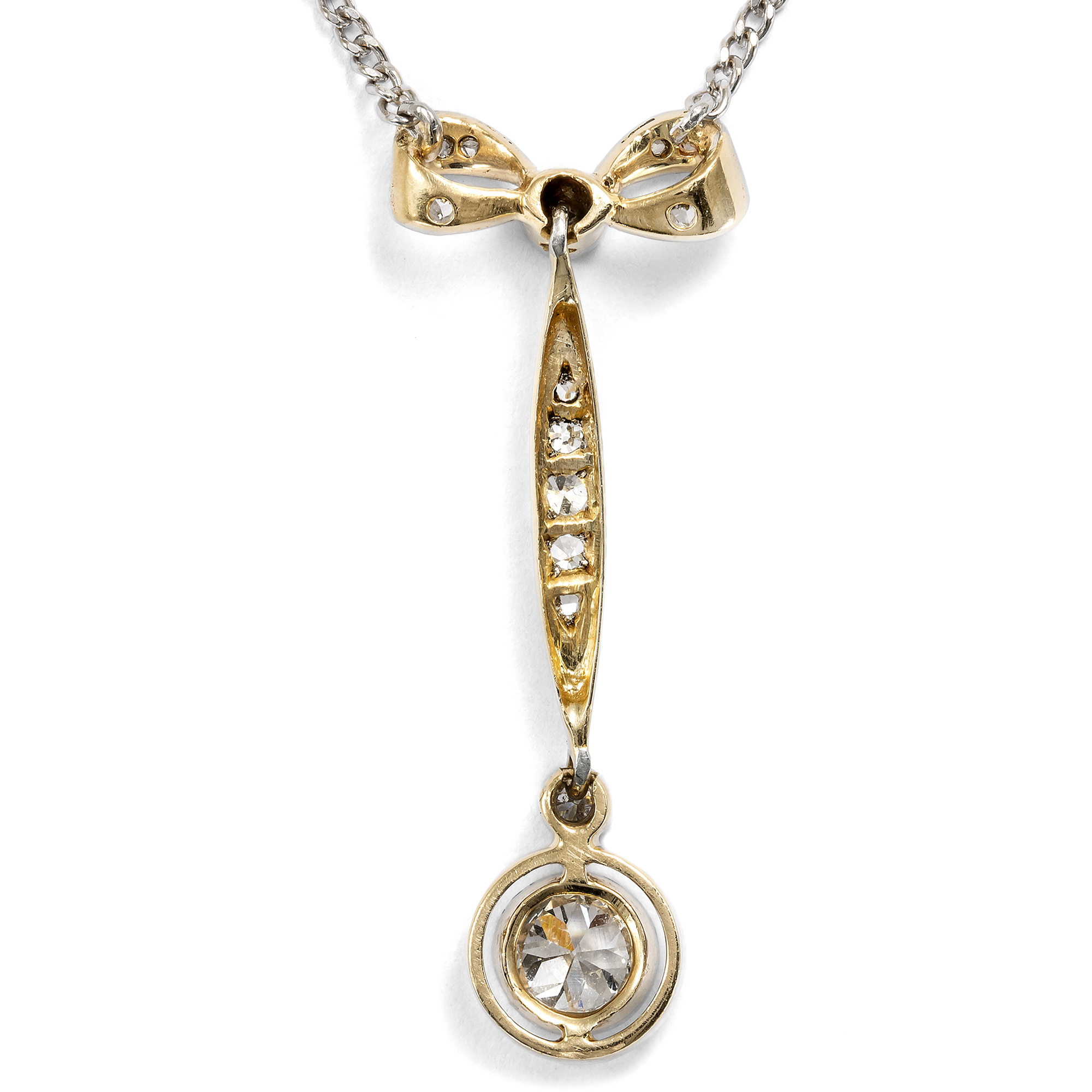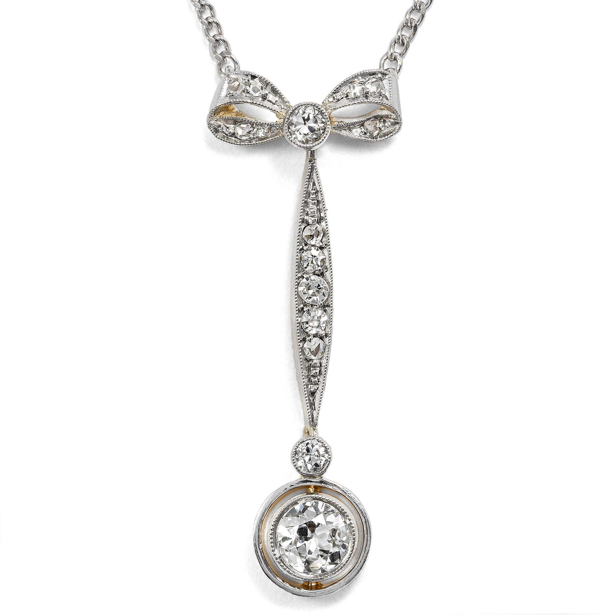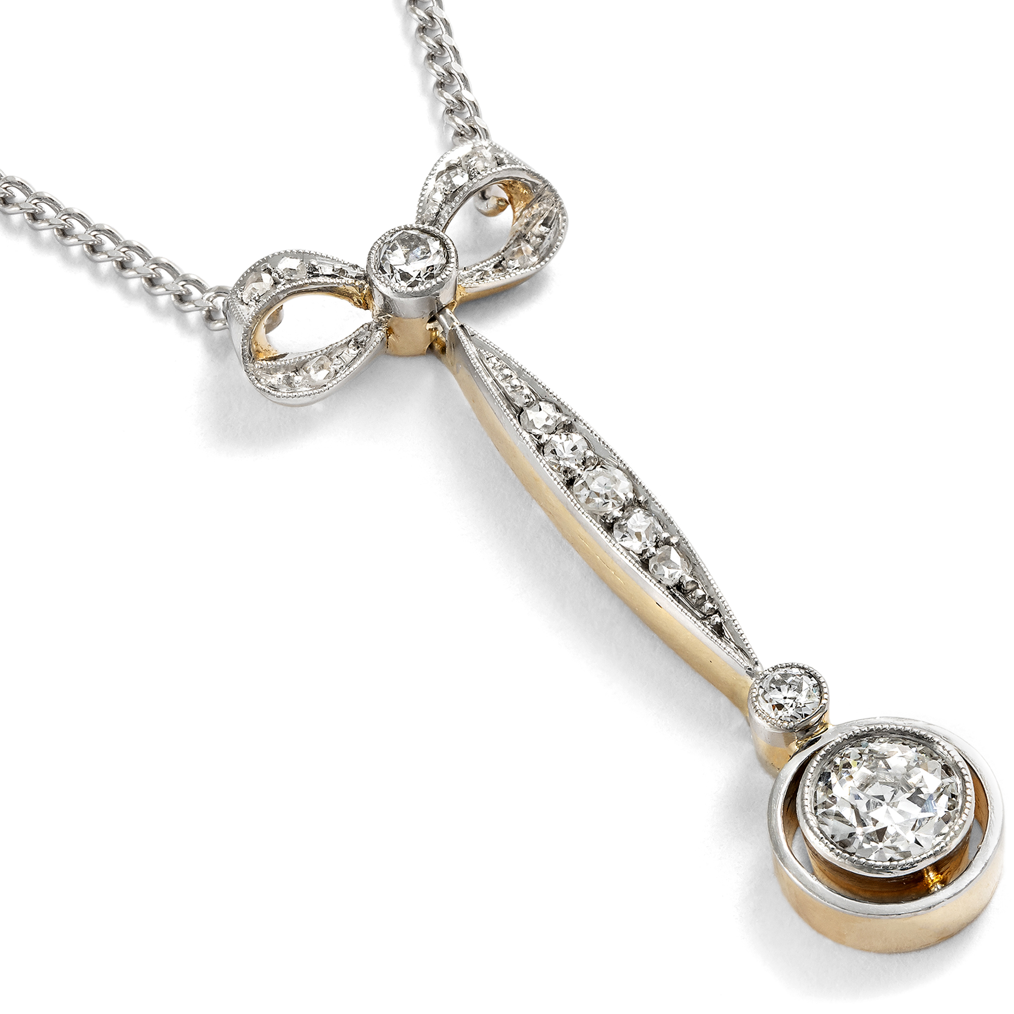 Leichtigkeit und Raffinesse waren die ästhetischen Ideale der Belle Époque, der lebensfrohen Jahre zwischen dem ausgehenden 19. Jahrhundert und dem Beginn des Ersten Weltkriegs. Diamanten leuchteten sternenhell in Platin. Galante Motive wie Lorbeergirlanden, Blüten und Schleifen – dem heiteren Neoklassizismus der Zeit Marie Antoinettes entlehnt – wurden zu immer neuen Schmuckkreationen zusammengefügt. Im elektrischen Licht hatten Adel und Industrielle des Abends viele Gelegenheiten, feine Schmuckstücke vorzuführen. Die Schleife ist auch das Motiv des hier vorliegenden zarten Colliers, gegen Ende der Belle Époque um 1910 entstanden. Es glänzt durch eine Platinauflage auf dem Goldkorpus strahlend weiß. Unter dem dreidimensionalen Schleifenmotiv, als dessen Knotenpunkt ein einzelner Diamant glänzt, befindet sich ein schlankes Pendel, das sich leicht weitend weitere Diamanten aufnimmt. Am unteren Ende pendelt sodann das Schaustück des Schmuckstücks: ein funkelnder Altschliff-Diamant von etwa 0,40 ct in einer raffinierten Illusionsfassung, die ihn mit Schatten umgibt und so seine Größe und Brillanz optisch erhöht. Das schöne Collier ist sehr gut erhalten. Vermutlich entstand es in Deutschland. In späterer Zeit wurde die Weißgoldkette erneuert.