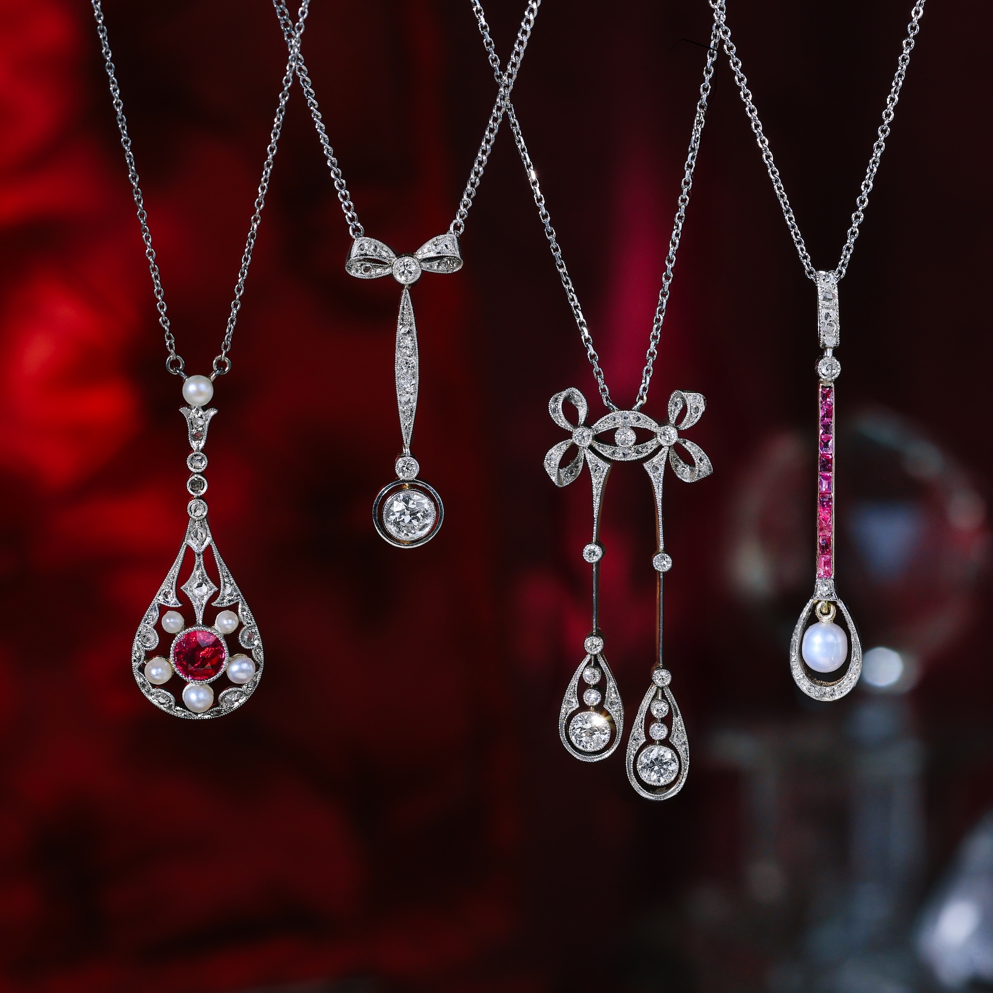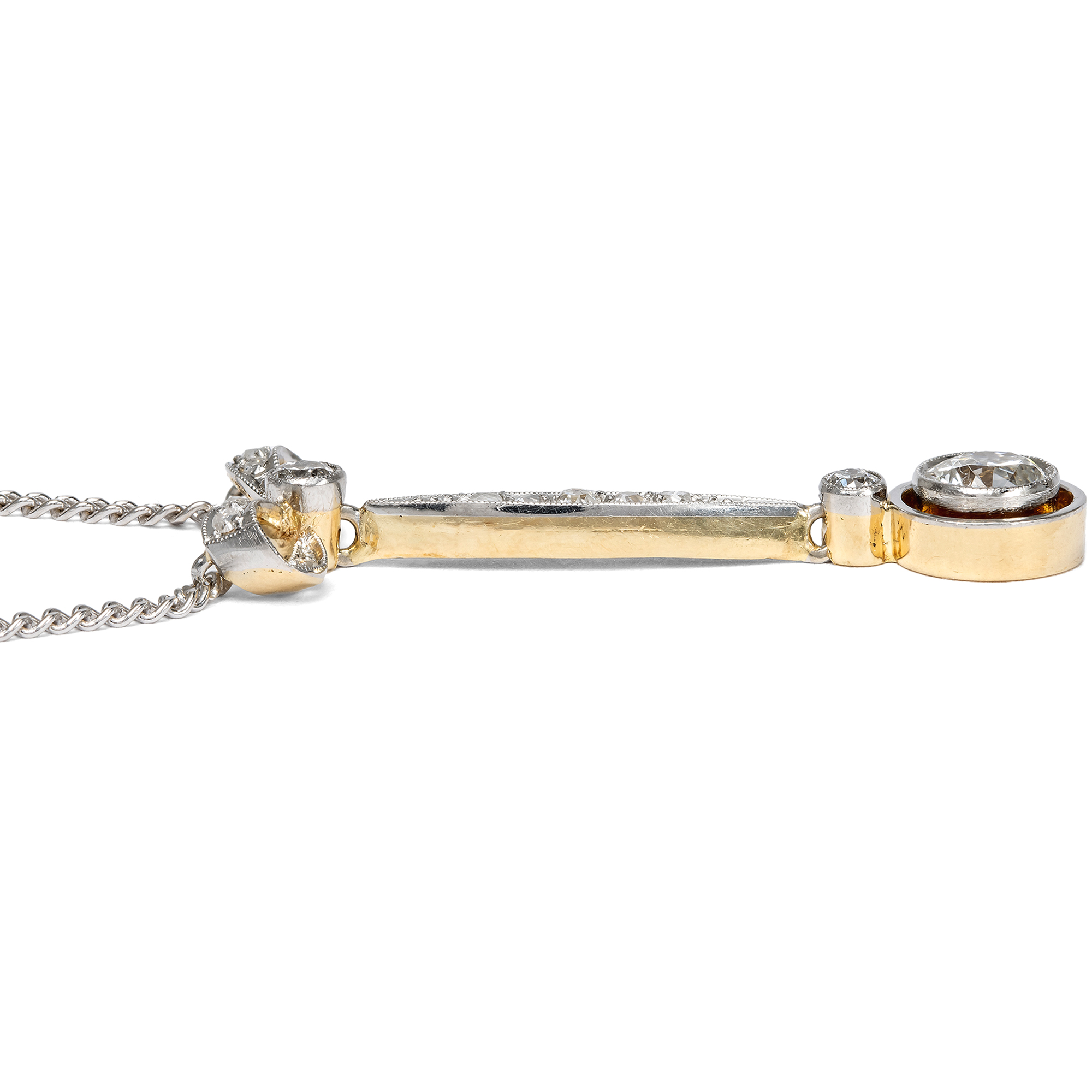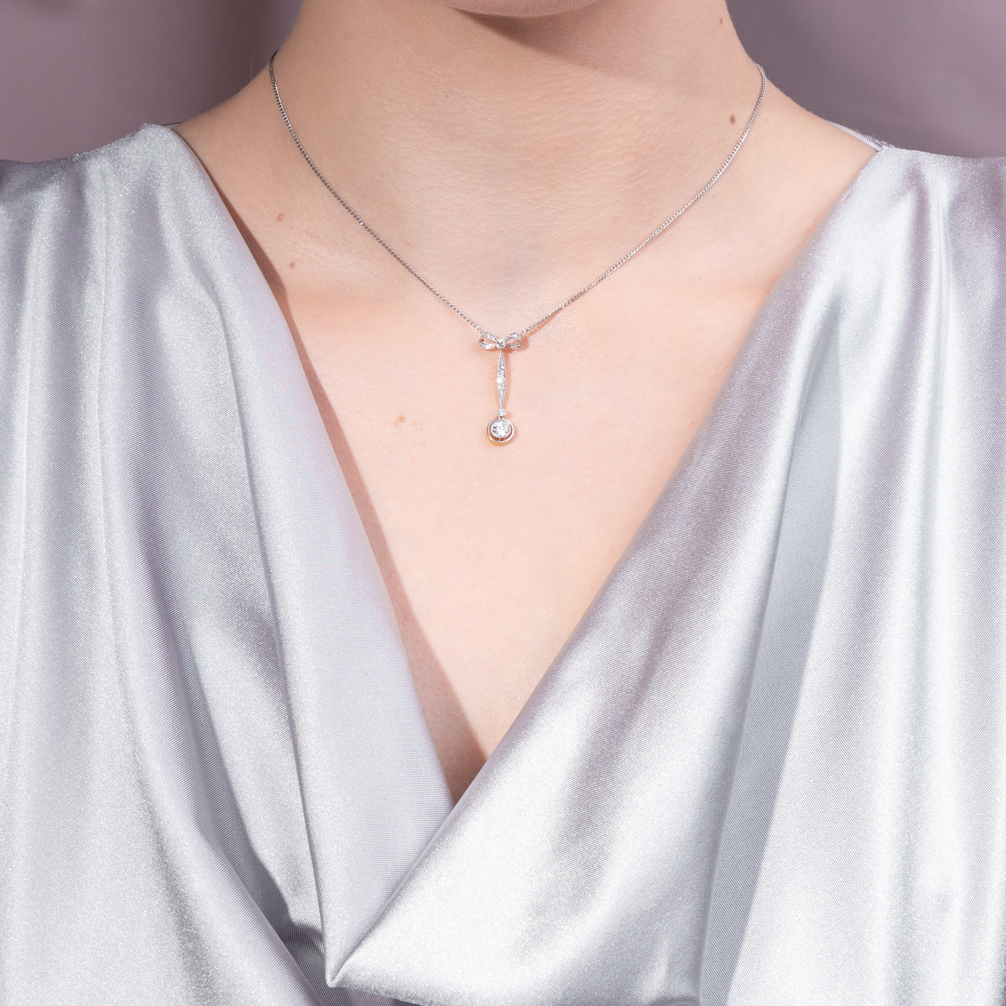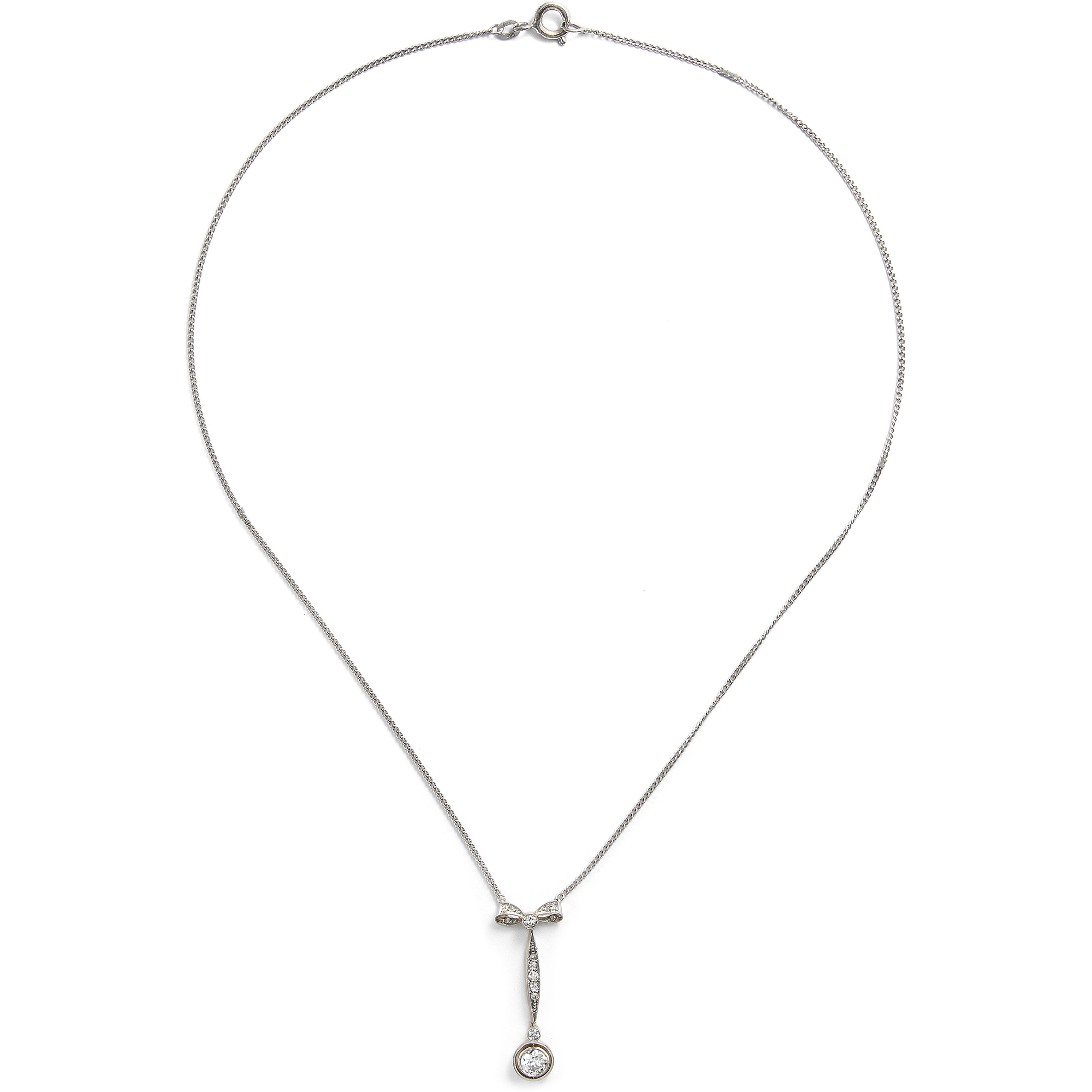Leichtigkeit und Raffinesse waren die ästhetischen Ideale der Belle Époque, der lebensfrohen Jahre zwischen dem ausgehenden 19. Jahrhundert und dem Beginn des Ersten Weltkriegs. Diamanten leuchteten sternenhell in Platin. Galante Motive wie Lorbeergirlanden, Blüten und Schleifen – dem heiteren Neoklassizismus der Zeit Marie Antoinettes entlehnt – wurden zu immer neuen Schmuckkreationen zusammengefügt. Im elektrischen Licht hatten Adel und Industrielle des Abends viele Gelegenheiten, feine Schmuckstücke vorzuführen. Die Schleife ist auch das Motiv des hier vorliegenden zarten Colliers, gegen Ende der Belle Époque um 1910 entstanden. Es glänzt durch eine Platinauflage auf dem Goldkorpus strahlend weiß. Unter dem dreidimensionalen Schleifenmotiv, als dessen Knotenpunkt ein einzelner Diamant glänzt, befindet sich ein schlankes Pendel, das sich leicht weitend weitere Diamanten aufnimmt. Am unteren Ende pendelt sodann das Schaustück des Schmuckstücks: ein funkelnder Altschliff-Diamant von etwa 0,40 ct in einer raffinierten Illusionsfassung, die ihn mit Schatten umgibt und so seine Größe und Brillanz optisch erhöht. Das schöne Collier ist sehr gut erhalten. Vermutlich entstand es in Deutschland. In späterer Zeit wurde die Weißgoldkette erneuert.