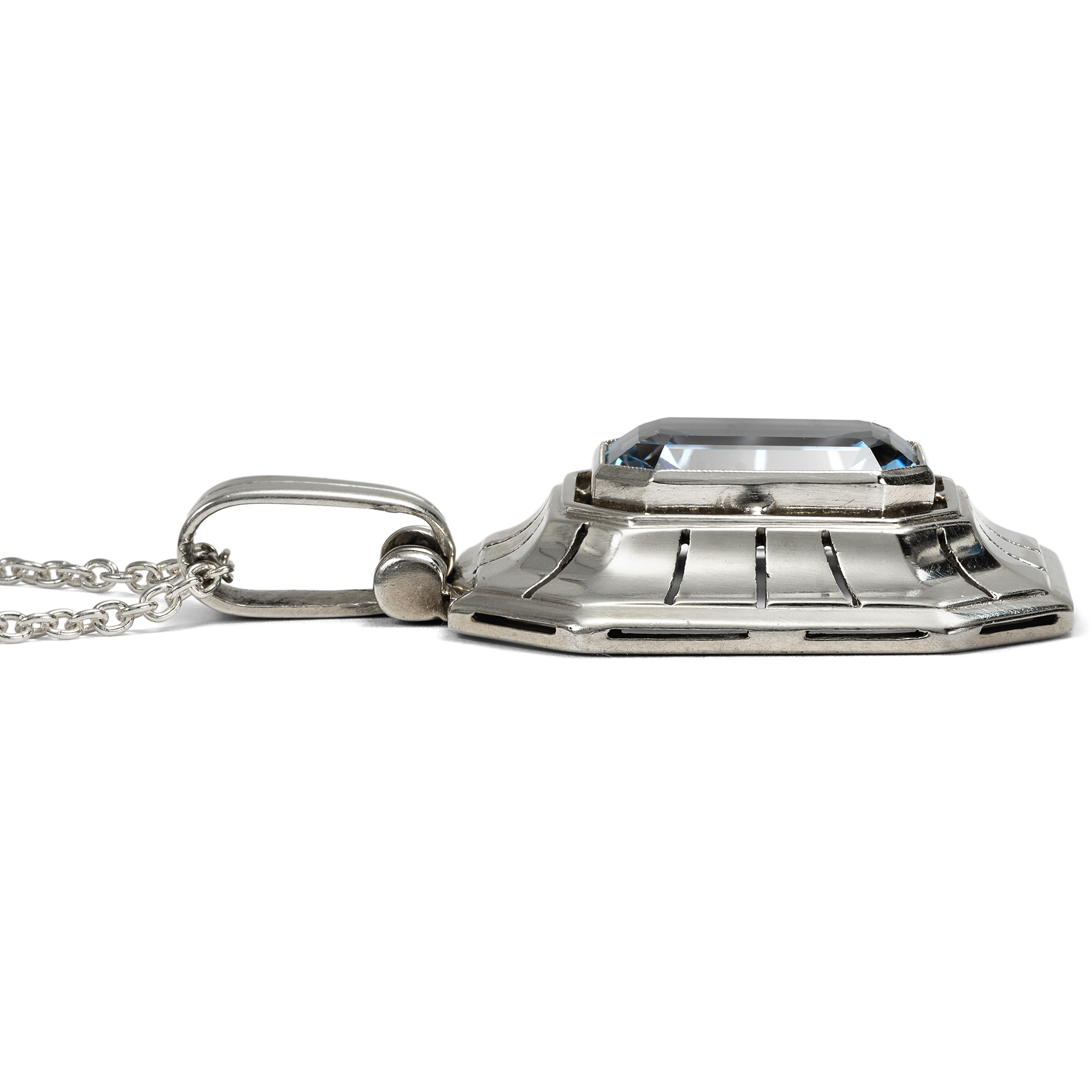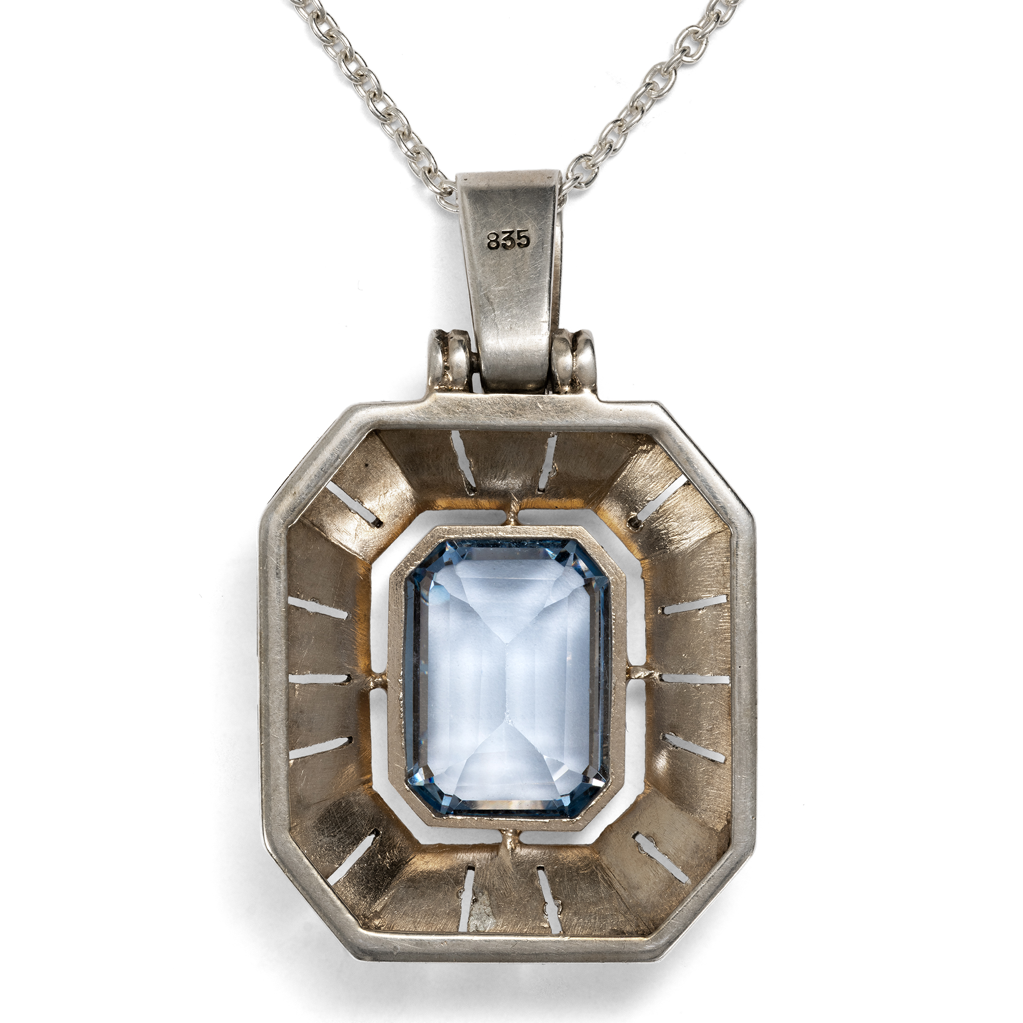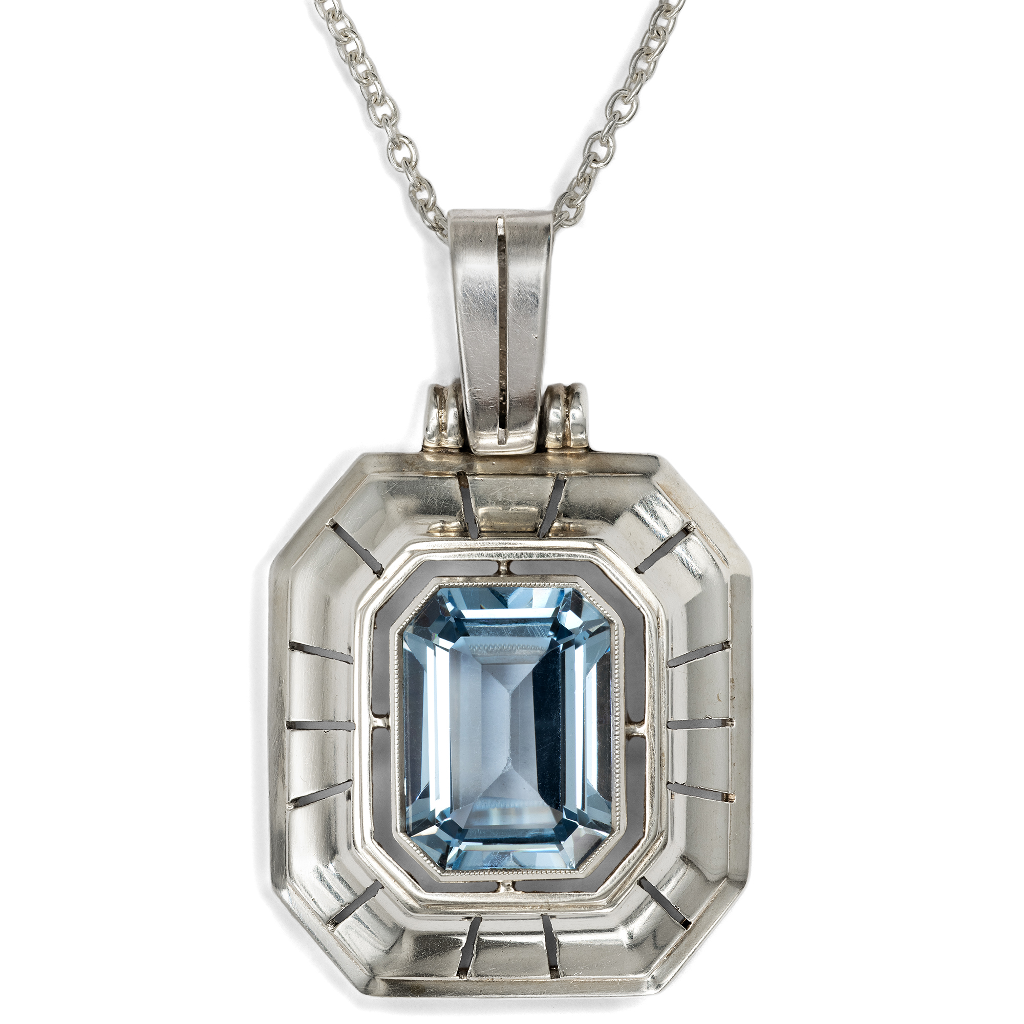 „Glanzleistungen der Technik sind die heutigen synthetischen Steine, die oft selbst vom Fachmann erst nach umständlicher Prüfung von echten Steinen zu unterscheiden sind. Besonders beliebt unter diesen kunstvollen Schöpfungen sind die Spinelle in der Farbe des Aquamarins mit einer bezaubernden Klarheit und Durchsichtigkeit. In echtem Silber gefasst, die Reife der Ringe aus echtem Gold, lösen sie ungeteilte Bewunderung aus!“ (Aus einem Schmuck-Katalog von 1939) Spinelle in der Farbe von Aquamarinen waren in den ersten Jahrzehnten des 20. Jahrhunderts der letzte Schrei, denn man konnte sie im Labor herstellen. So konnten sich auch Damen mit schmalerem Geldbeutel plötzlich schöne Schmucksteine leisten, die (fast) genauso aussahen wie die kostbaren Aquamarine aus dem fernen Brasilien. Der vorliegende Anhänger ist ein Beispiel aus jener Zeit, in welcher der oben zitierte Werbetext geschrieben wurde. Er präsentiert einen aquamarinfarbenen, synthetisch hergestellten Spinell in einer Fassung aus Silber. Kraftvolle Rahmen, Schattenfugen und polierte Flächen halten den Stein und zeigen eine Formensprache, die auf die Streamline Moderne und das späte Art Déco verweist. Eine schlichte Silberkette, von uns ergänzt, komplettiert den schönen Anhänger.