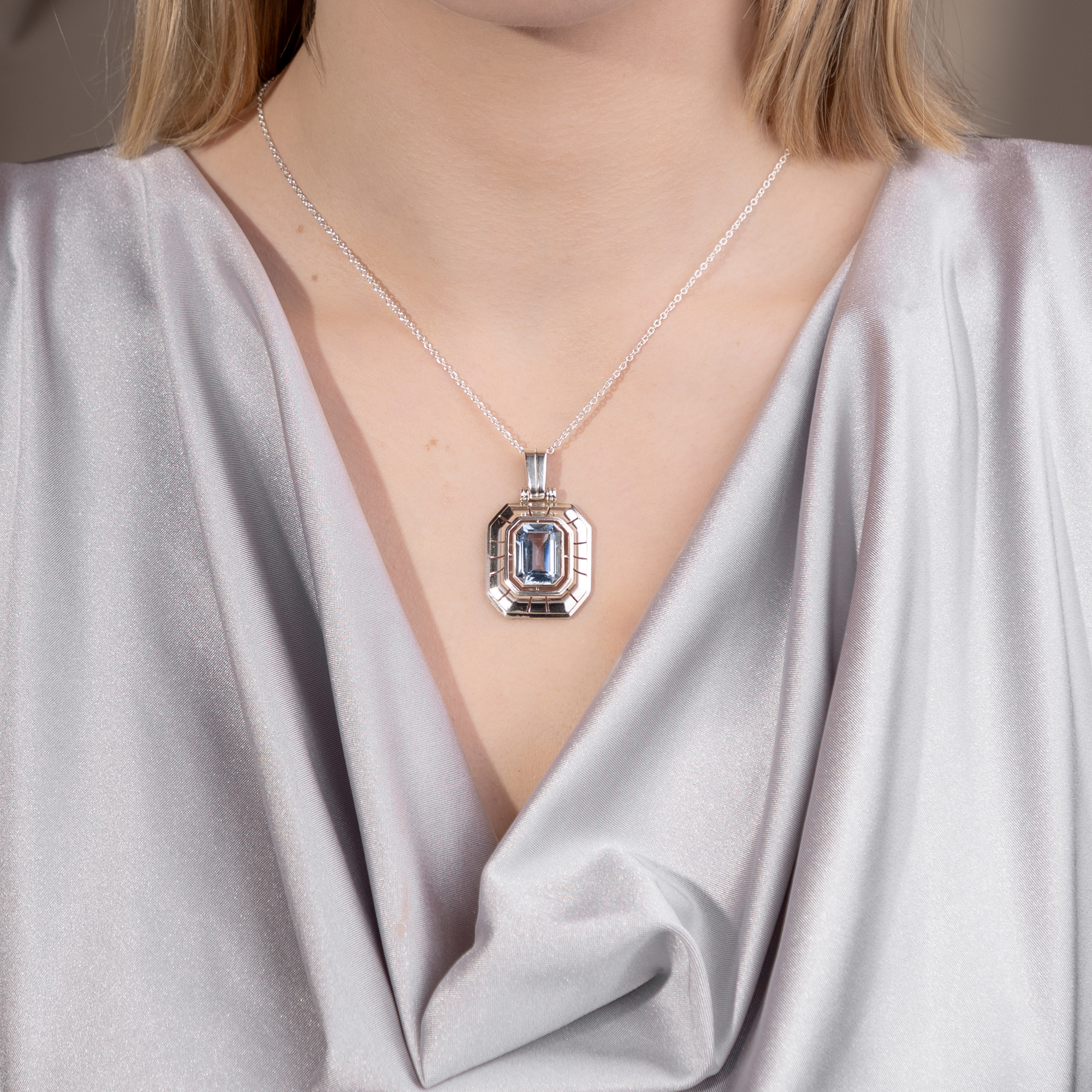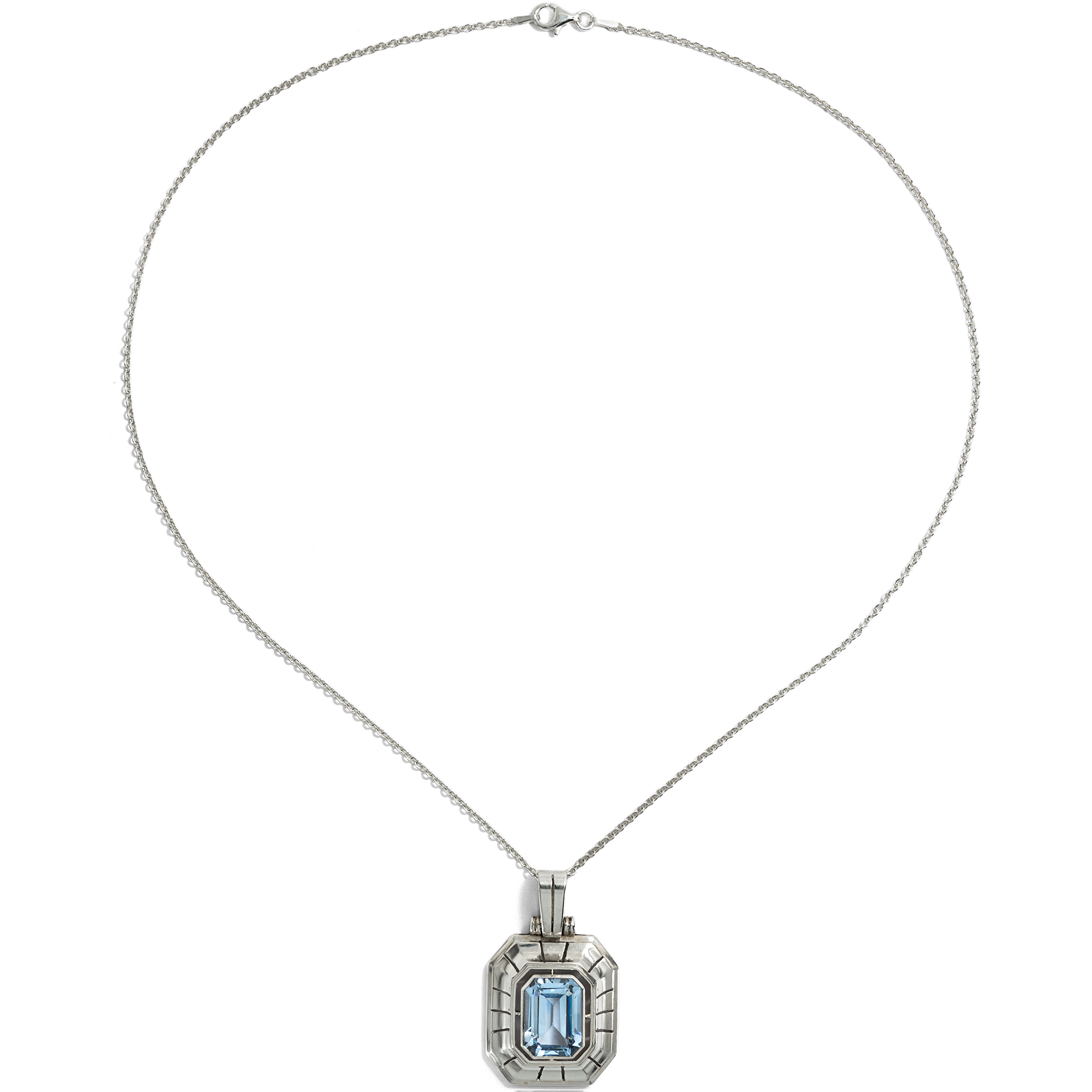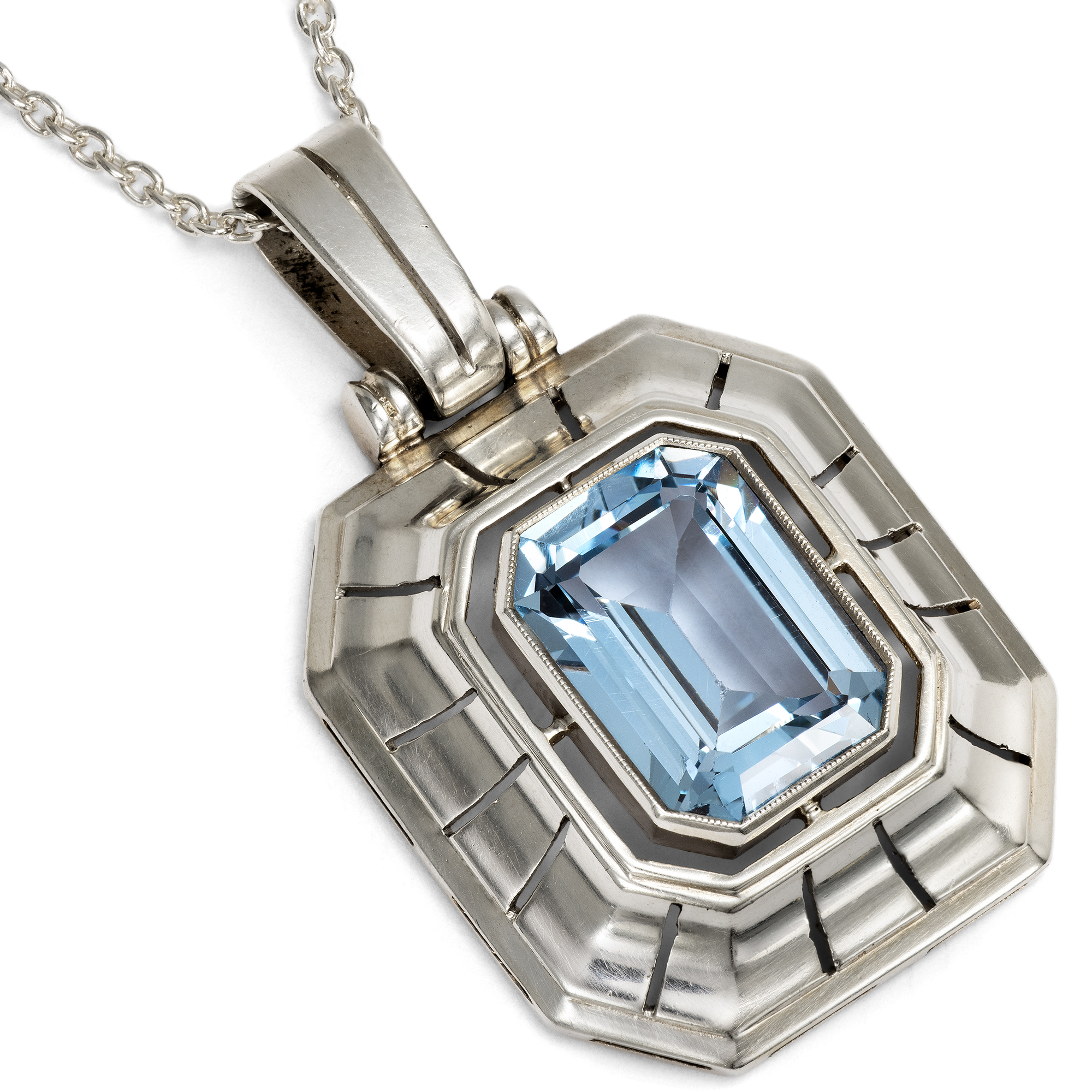 „Glanzleistungen der Technik sind die heutigen synthetischen Steine, die oft selbst vom Fachmann erst nach umständlicher Prüfung von echten Steinen zu unterscheiden sind. Besonders beliebt unter diesen kunstvollen Schöpfungen sind die Spinelle in der Farbe des Aquamarins mit einer bezaubernden Klarheit und Durchsichtigkeit. In echtem Silber gefasst, die Reife der Ringe aus echtem Gold, lösen sie ungeteilte Bewunderung aus!“ (Aus einem Schmuck-Katalog von 1939) Spinelle in der Farbe von Aquamarinen waren in den ersten Jahrzehnten des 20. Jahrhunderts der letzte Schrei, denn man konnte sie im Labor herstellen. So konnten sich auch Damen mit schmalerem Geldbeutel plötzlich schöne Schmucksteine leisten, die (fast) genauso aussahen wie die kostbaren Aquamarine aus dem fernen Brasilien. Der vorliegende Anhänger ist ein Beispiel aus jener Zeit, in welcher der oben zitierte Werbetext geschrieben wurde. Er präsentiert einen aquamarinfarbenen, synthetisch hergestellten Spinell in einer Fassung aus Silber. Kraftvolle Rahmen, Schattenfugen und polierte Flächen halten den Stein und zeigen eine Formensprache, die auf die Streamline Moderne und das späte Art Déco verweist. Eine schlichte Silberkette, von uns ergänzt, komplettiert den schönen Anhänger.