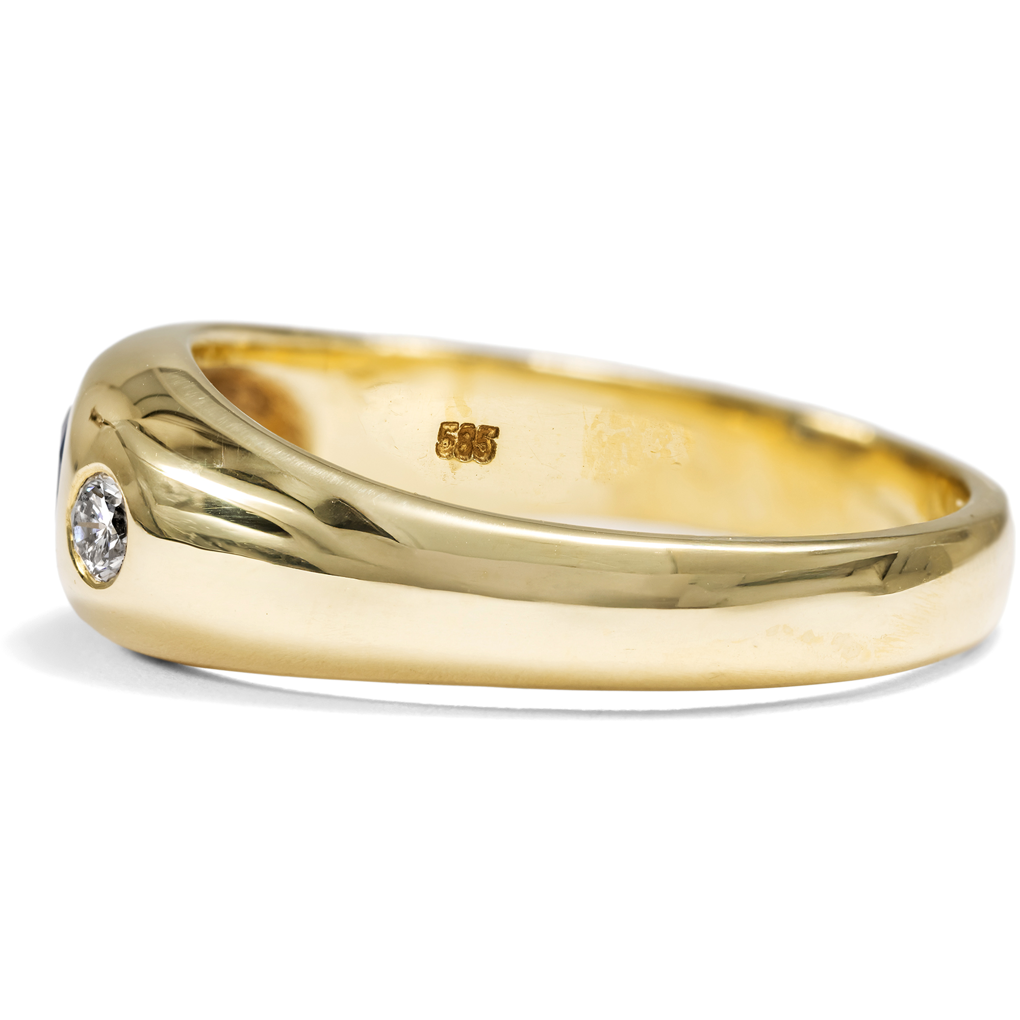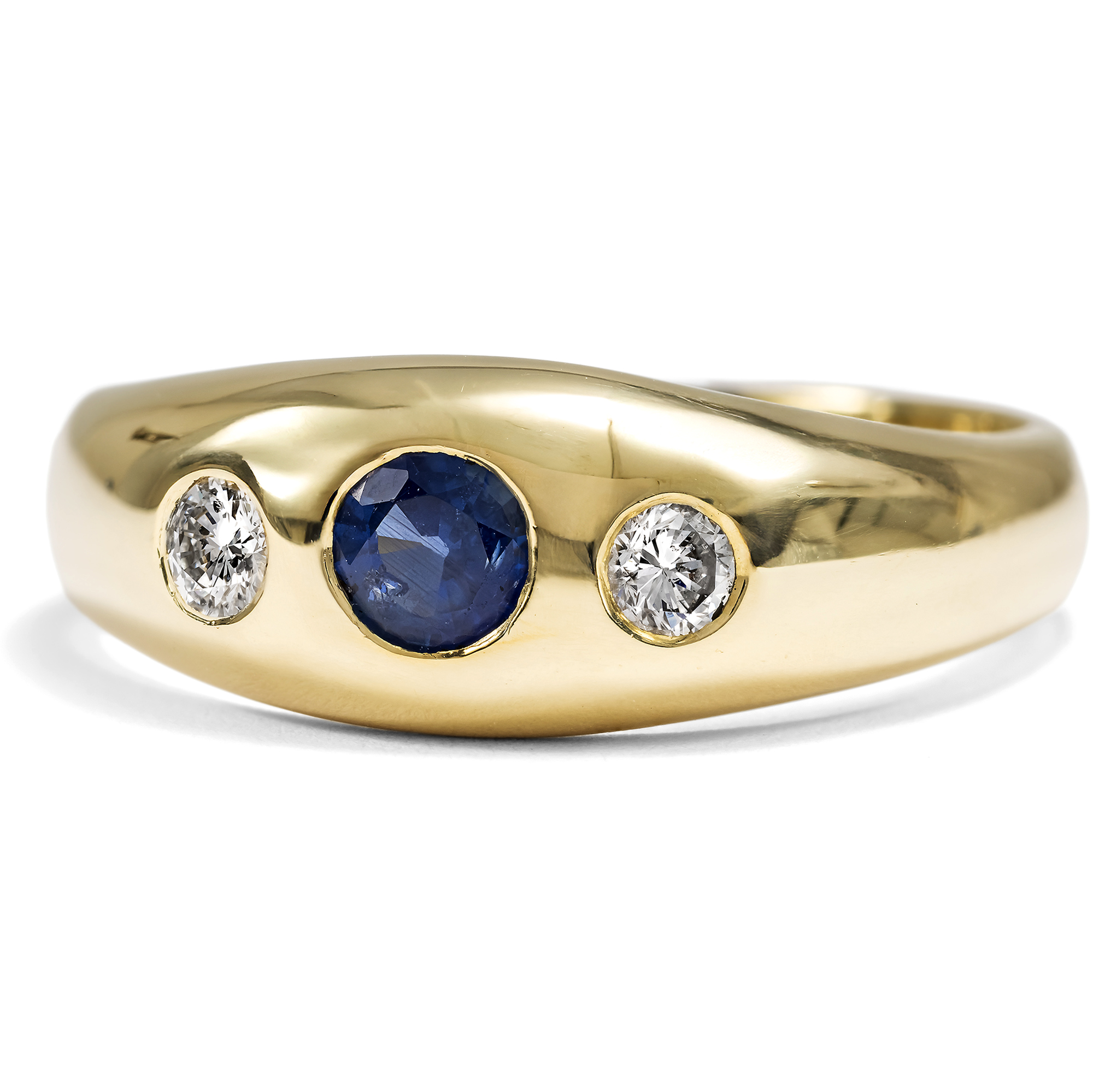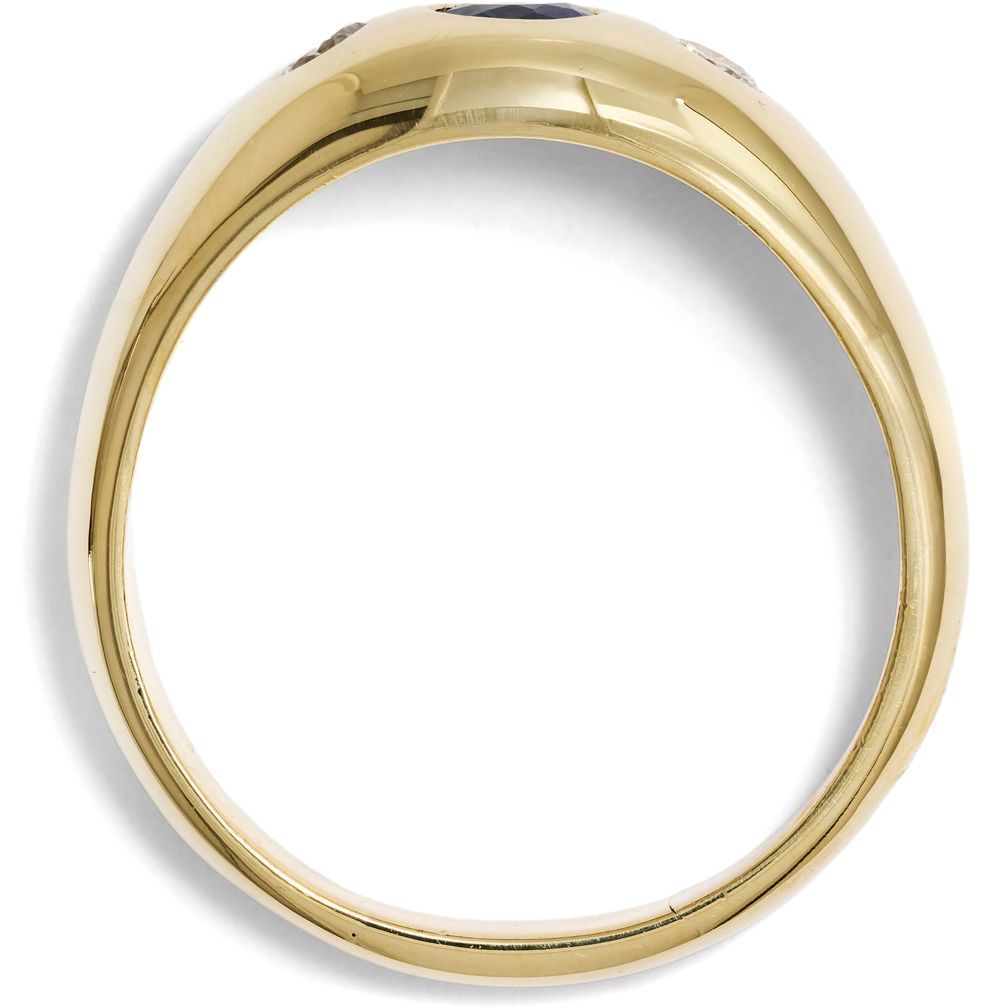 Dieser Vintage-Bandring zeichnet sich durch eine massiv gearbeitete Ringschiene aus Gelbgold aus und wird von drei Edelsteinen in schöner Qualität geschmückt. Zwei Diamanten im Brillantschliff von jeweils 0,13 ct rahmen einen oval facettierten blauen Saphir, der den Blickpunkt des Ringes bildet. Zur Oberseite hin weitet sich die Ringschiene leicht. Ringe, bei denen die Steine der Form der Schiene folgen, werden auch als Allianzringe bezeichnet. Die Reihe von drei Edelsteinen lässt sich symbolisch deuten: sie kann dann für gemeinsam erlebte Zeitlichkeit – Vergangenheit, Gegenwart und Zukunft – stehen. Der Fokus des vorliegenden Rings liegt auf dem größten Stein, dem mittleren Saphir, der für die Gegenwart steht und dazu anregt, den Augenblick zu nutzen und zu genießen. Der Ring wird so zu einem „Carpe Diem!“ in Juwelenform. Der schlichte und dennoch besondere Ring ist qualitätvoll gefertigt und laut Stempelung deutscher Herkunft. Mit seiner klassischen Form ist er gleichermaßen für Damen und Herren geeignet. Zu uns kam er aus dem Rheinland.
