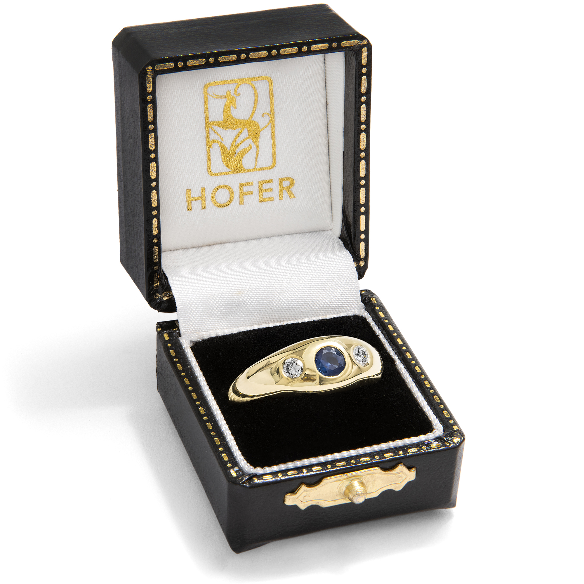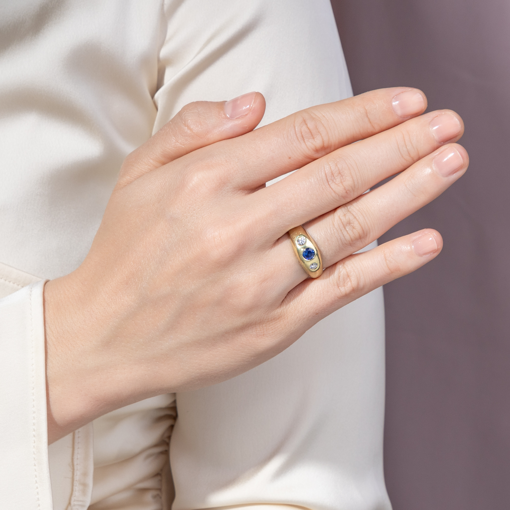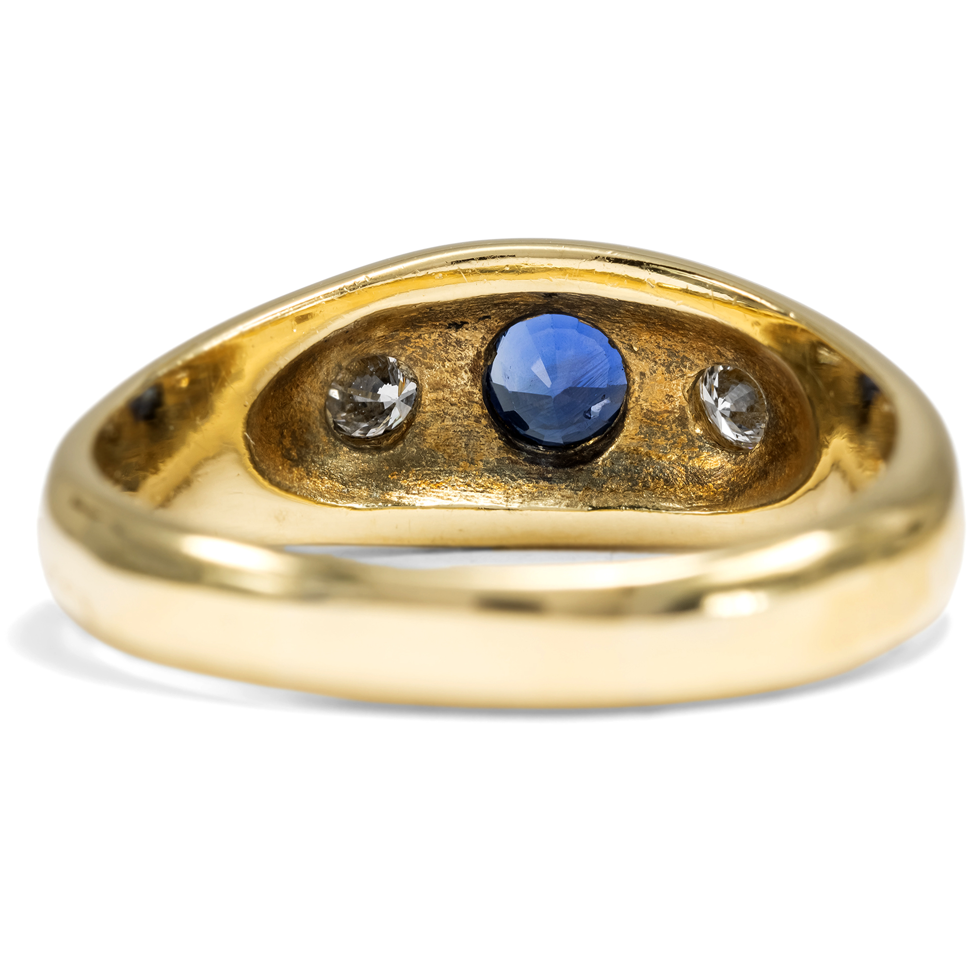 Dieser Vintage-Bandring zeichnet sich durch eine massiv gearbeitete Ringschiene aus Gelbgold aus und wird von drei Edelsteinen in schöner Qualität geschmückt. Zwei Diamanten im Brillantschliff von jeweils 0,13 ct rahmen einen oval facettierten blauen Saphir, der den Blickpunkt des Ringes bildet. Zur Oberseite hin weitet sich die Ringschiene leicht. Ringe, bei denen die Steine der Form der Schiene folgen, werden auch als Allianzringe bezeichnet. Die Reihe von drei Edelsteinen lässt sich symbolisch deuten: sie kann dann für gemeinsam erlebte Zeitlichkeit – Vergangenheit, Gegenwart und Zukunft – stehen. Der Fokus des vorliegenden Rings liegt auf dem größten Stein, dem mittleren Saphir, der für die Gegenwart steht und dazu anregt, den Augenblick zu nutzen und zu genießen. Der Ring wird so zu einem „Carpe Diem!“ in Juwelenform. Der schlichte und dennoch besondere Ring ist qualitätvoll gefertigt und laut Stempelung deutscher Herkunft. Mit seiner klassischen Form ist er gleichermaßen für Damen und Herren geeignet. Zu uns kam er aus dem Rheinland.