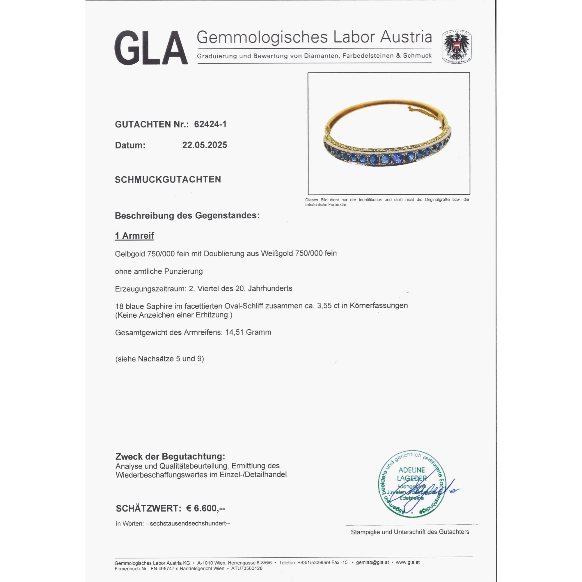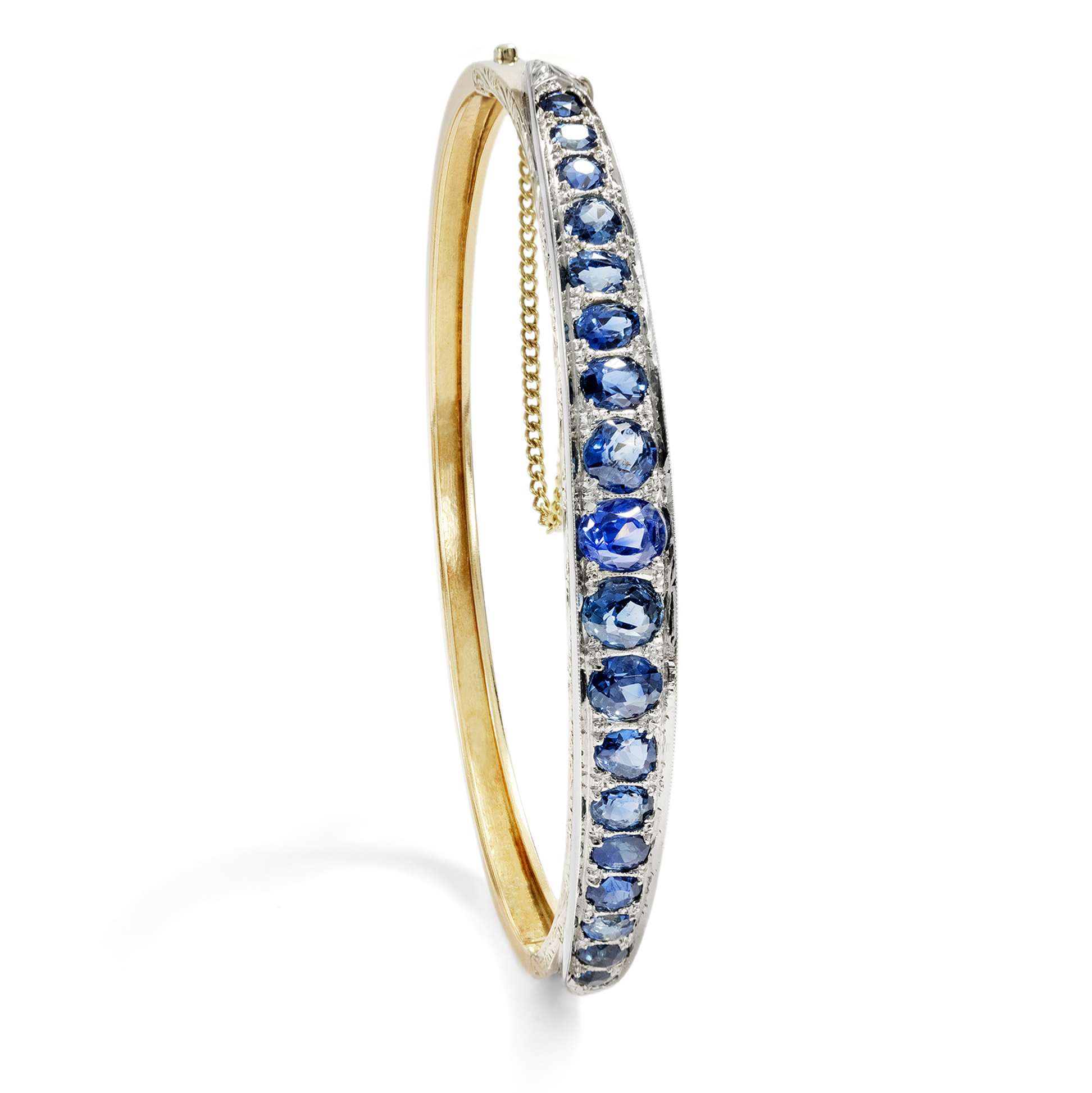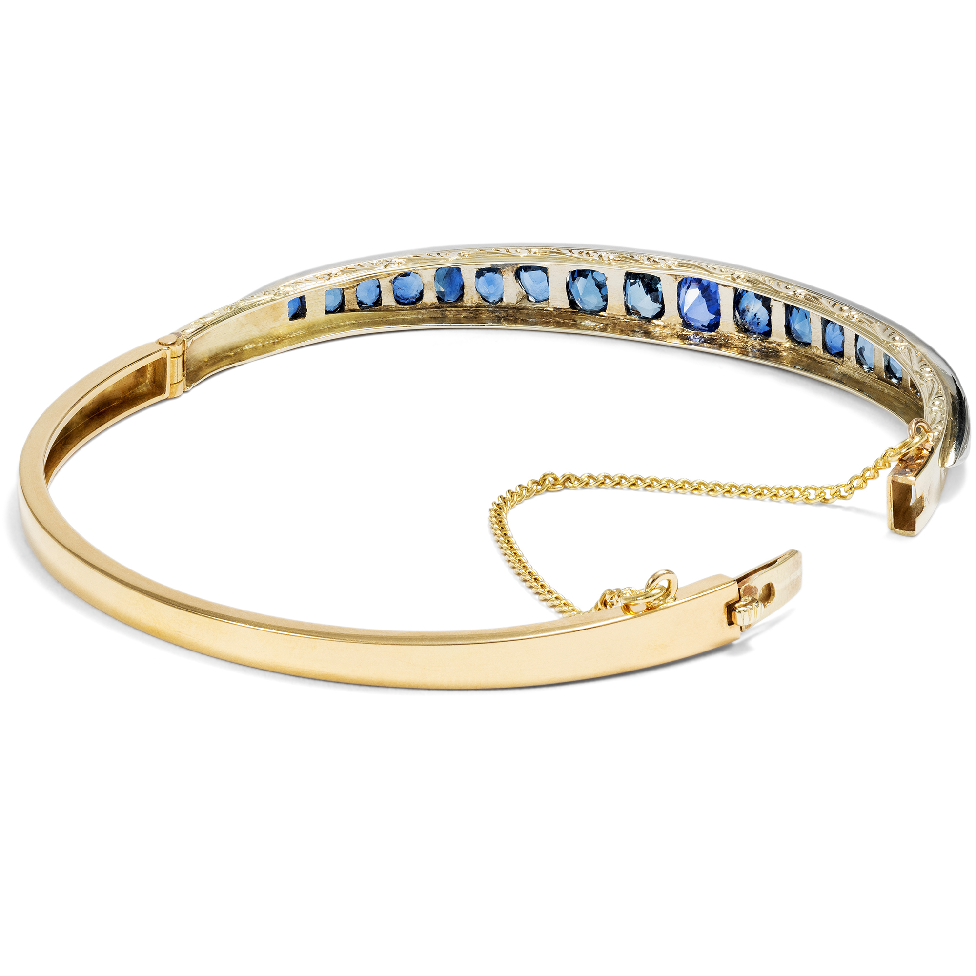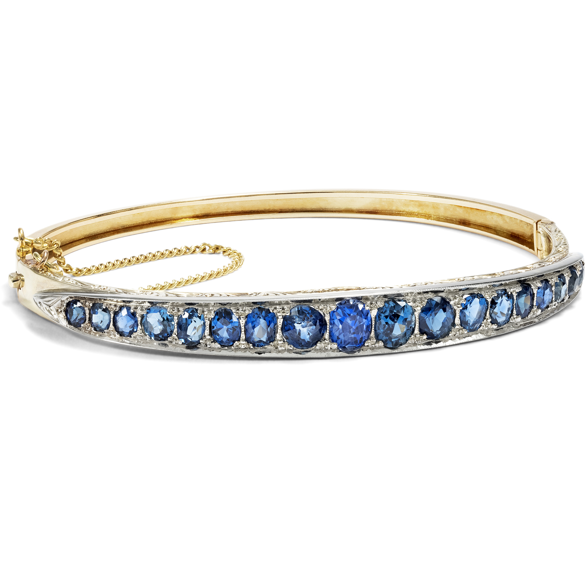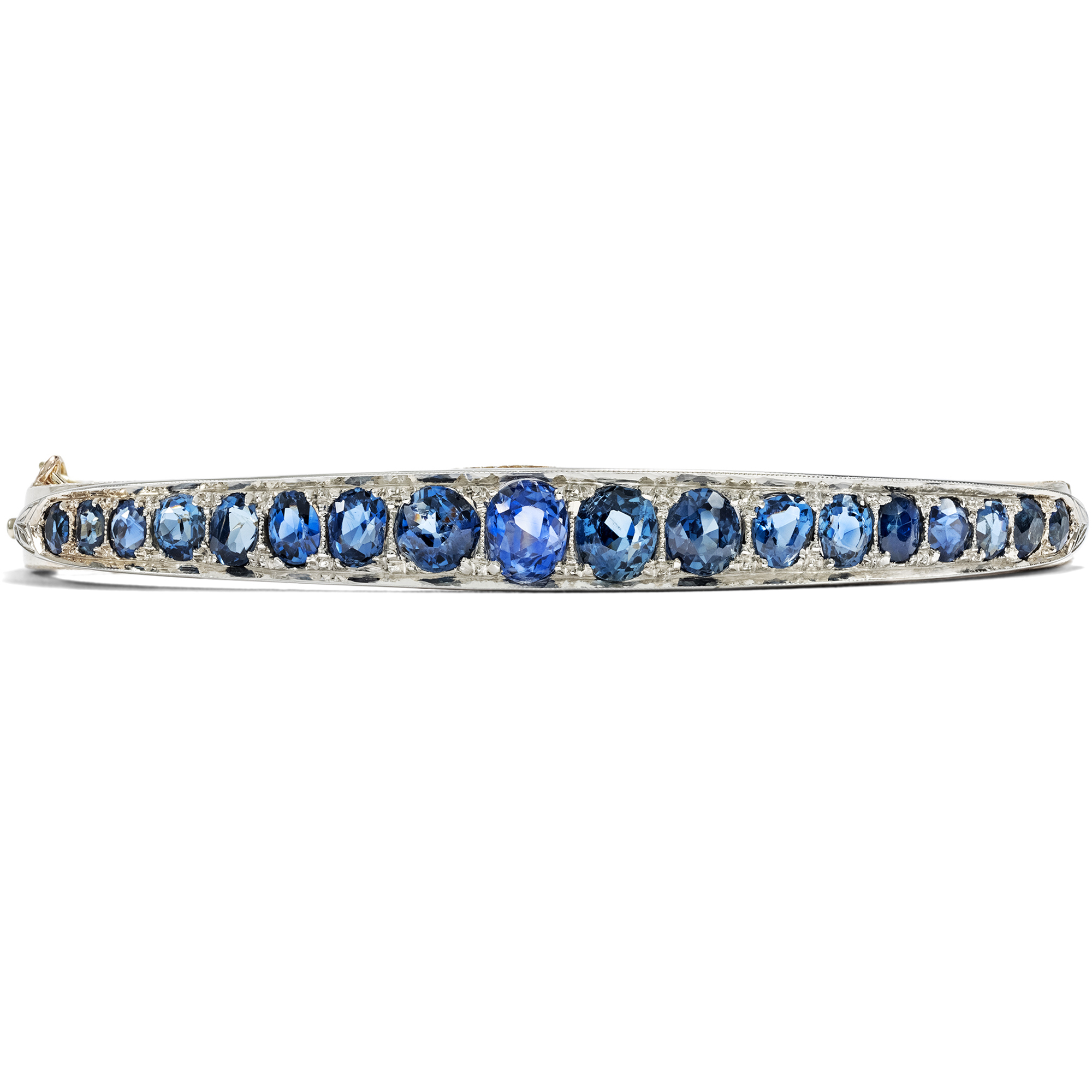 Heute wie bereits vor einem oder zwei Jahrhunderten gilt dieselbe Regel: Nicht jede Freundin schöner Schmuckstücke trägt zur selben Zeit Juwelen im selben Stil. Ein berühmtes Beispiel ist etwa der Diamantschmuck des 19. Jahrhunderts, der im höfischen Umfeld noch lange die Formen des 18. Jahrhunderts beibehielt. Und selbst wenn wir durch antike Schmuckkataloge der 1920er Jahre blättern, finden wir auf den ersten Seiten die mutigen Neuheiten – weiter hinten im Katalog jedoch die Klassiker, die sich an Damen richteten, die lieber klassisch als modern geschmückt sein wollten. Einer solchen Dame, einer Anhängerin des unaufgeregten Luxus und der bewährten Designs, wird der vorliegende Armreif ursprünglich gehört haben. Denn obwohl er einem typischen viktorianischen Design der 1890er Jahre folgt, ist er ausweislich einiger kleiner Details erst ein paar Dekaden später entstanden – dabei jedoch so zeitlos, dass sich schwer sagen lässt, ob dies nun in den 1920er oder in den 1950er Jahren geschah. Zugleich ist er mit dem größten Luxus ausgestattet: 3,55 ct wunderbarer mittelblauer Saphire reihen sich dicht an dicht, gefasst in geradlinige Weißgoldfassungen. Die Steine haben leicht unterschiedliche Schattierungen, und ein jeder ist ein kleines Unikat. Sie zeigen keine Anzeichen einer Behandlung, sondern ihre Farbe und Transparenz sind Produkte der Natur. Wir haben zu dem Reif ein unabhängiges gemmologisches Gutachten erstellen lassen, das mit dem Schmuckstück geliefert wird. Ein zeitloses Juwel, das keine Gefahr läuft, aus der Mode zu kommen.
