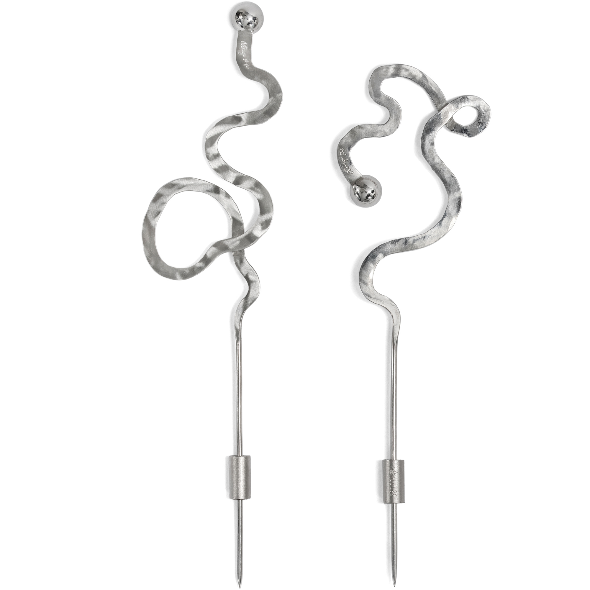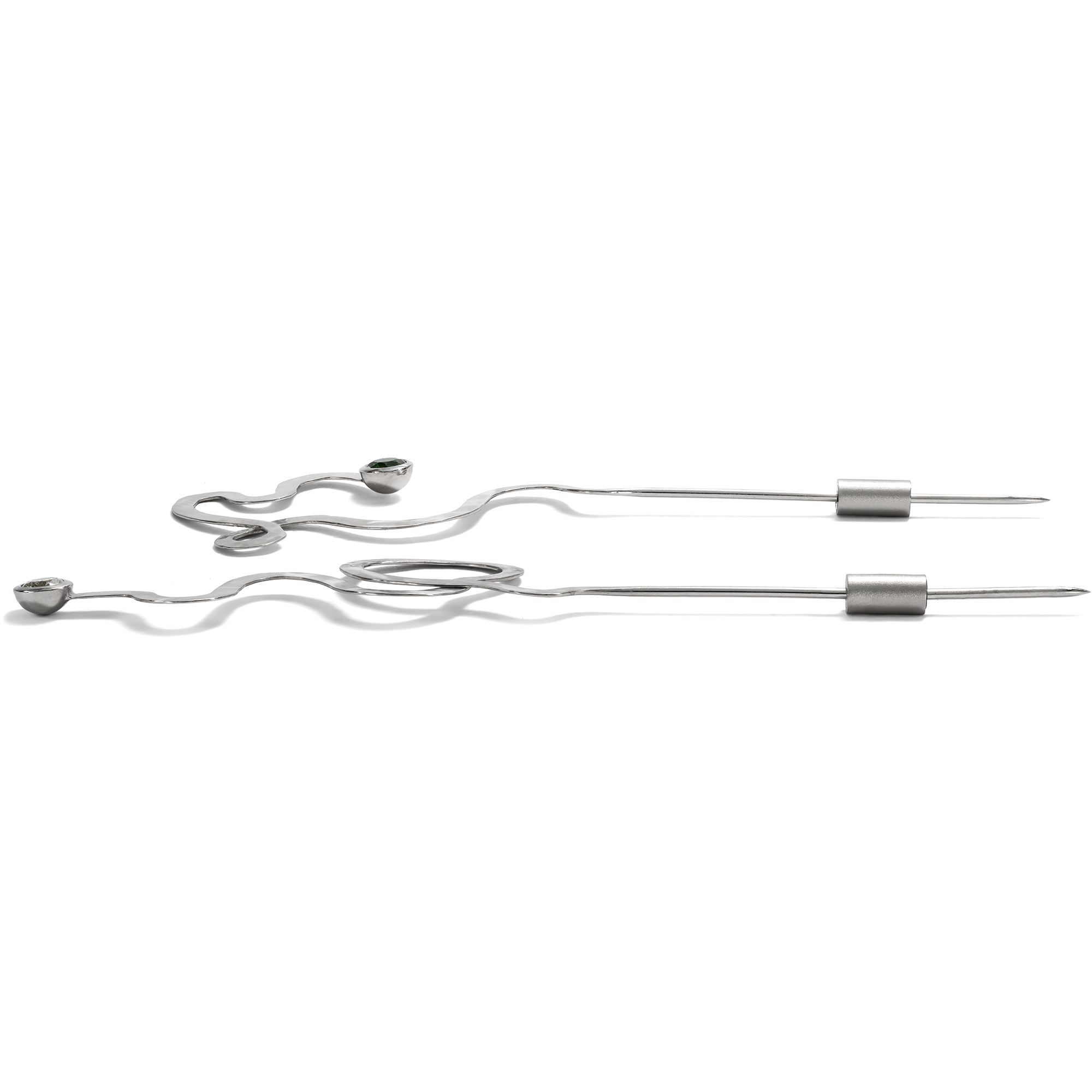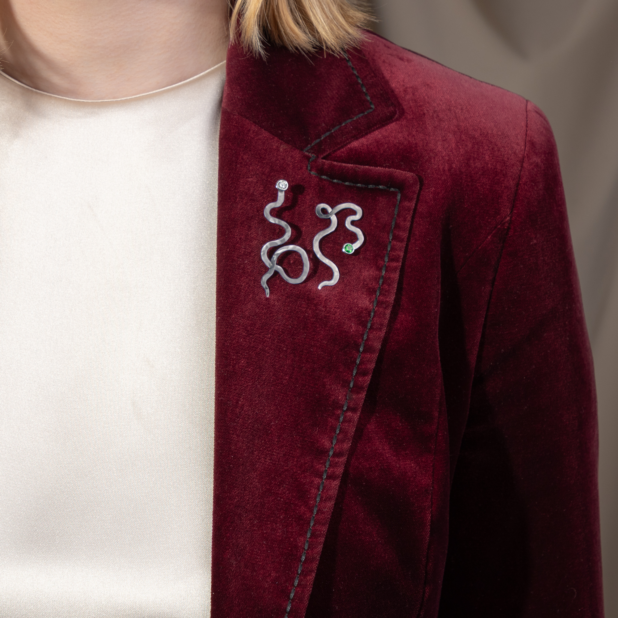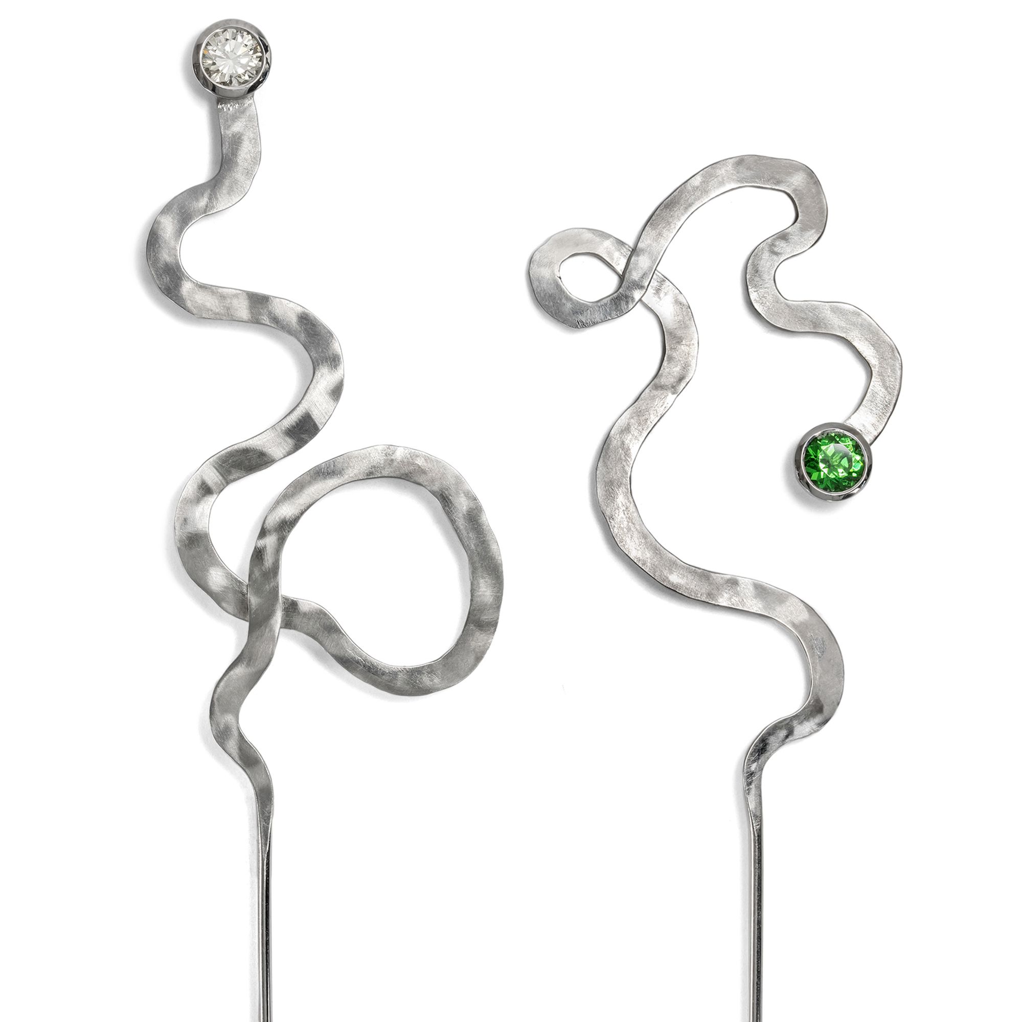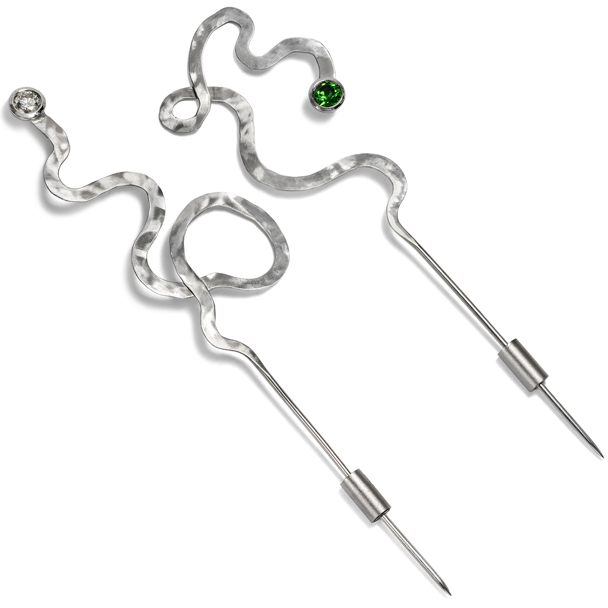 Im Grunde sind Broschen die vielleicht kreativsten Schmuckstücke überhaupt: Wo ein Ring oder ein Collier schnell unbequem wird, wenn der Entwurf zu ausladend, zu kantig oder zu groß gestaltet ist, können Broschen ungewöhnliche Formen annehmen, die eigenwillig und spielerisch wirken, ohne an Tragbarkeit einzubüßen. Sie werden auf Stoff getragen und lassen sich unendlich vielseitig einsetzen. Auf Jacken, Hüten oder sogar auf Taschen setzen sie glanzvolle Akzente. Dieses Paar Anstecknadeln, das aus Berlin-Dahlem zu uns kam, führt dies auf besonders anschauliche Weise vor Augen. Beide Nadeln sind aus massivem Platindraht von Hand geschmiedet. In expressiv geschwungenen, nahezu malerisch wirkenden Linien entfaltet sich das in diesem Bereich flach geschmiedete Metall und scheint dabei eine Bewegung der Edelsteine nachzuempfinden, die es an seinen Enden trägt. Ein Brillant in der einen Nadel und ein leuchtend grüner Tsavolith in der anderen Nadel sind in Halbschalen gefasst und markieren die Endpunkte dieser fließenden Formen. Der Tsavorit, eine seltene grüne Varietät des Granats, wurde erst in den 1960er Jahren in Ostafrika entdeckt, wo er insbesondere in Kenia und Tansania gefördert wird, und besticht durch sein lebendiges, klares Grün. Signiert ist das unikale Paar mit „Xing“ in feiner Handgravur auf den Rückseiten. Der Fantasie, wie sich diese beiden Anstecknadeln tragen und kombinieren lassen, sind keine Grenzen gesetzt. Ob einzeln oder gemeinsam, eine links, eine rechts, am Hut oder am Revers – sie laden zu einem spielerischen Ausprobieren ein.